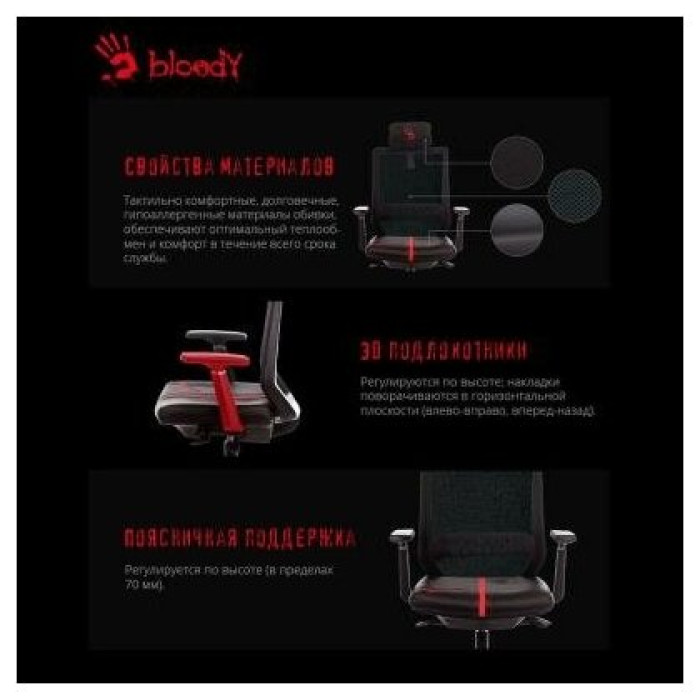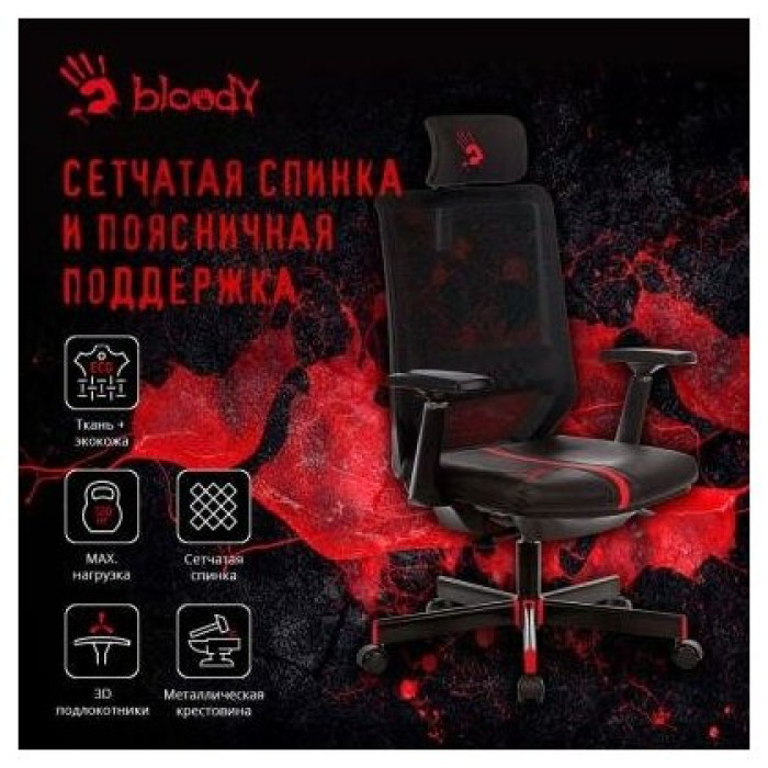 Кресло игровое A4Tech Bloody GC-900 выведет вас на лидирующие позиции в любой баталии, ведь оно обеспечит максимум комфорта и удобства в процессе насыщенного игрового сражения. Меняющие положение в 3 различных направлениях подлокотники, сетчатая спинка и мягкий подголовник – далеко не полный список достоинств данного аксессуара.