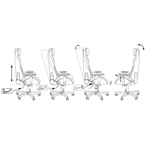 наклон спинки, настраиваемые подлокотники, подушка для поддержания головы, поясничная подушка