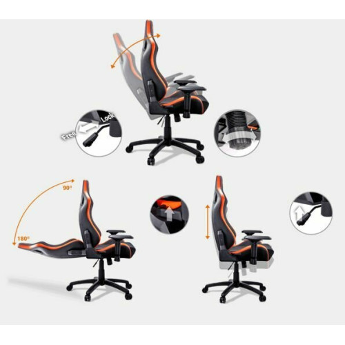 механизм качания, наклон спинки, настраиваемые подлокотники, подушка для поддержания головы, поясничная подушка