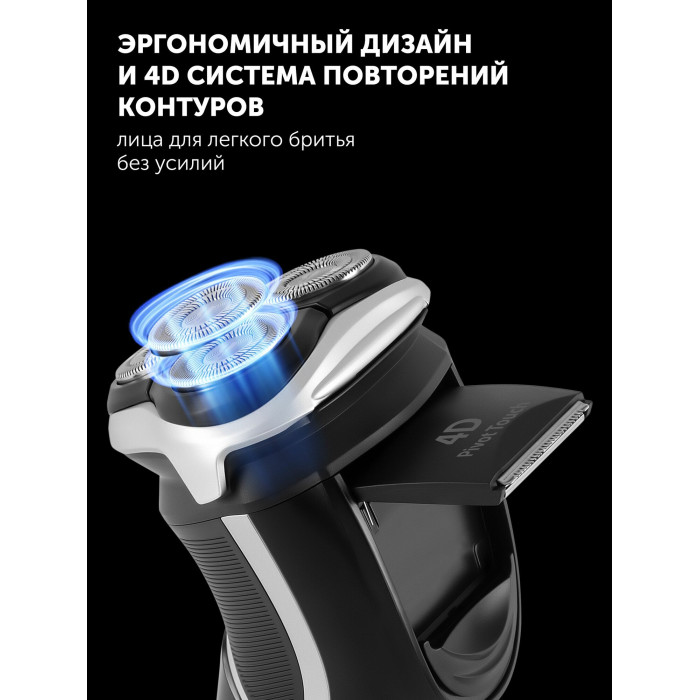 Прибор PMR 0421RC Pivot Touch 4D PRO - 1 шт.; Щеточка для чистки - 1 шт.; Масло для лезвий - 1 шт.; Адаптер питания - 1 шт.; Шнур для зарядки - 1 шт.; Чехол дорожный - 1 шт.; Руководство по эксплуатации - 1 шт.; Гарантийный талон - 1шт.