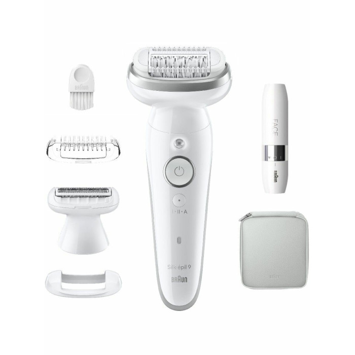 Эпилятор, документация, чехол, щеточка, зарядное устройство, мини-триммер, насадка-бритва, насадка-триммер, насадка для плотного контакта с кожей