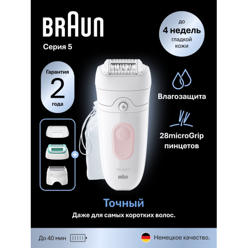 1 x эпилятор Braun Silk-épil 5; 1 x бритвенная сеточная насадка; 1 x насадка для начинающих; 1 x колпачок-триммер; 1 х мешочек для хранения; 1 x щёточка для чистки; 1 x кабель питания; 1 x батарейка; инструкция по применению; гарантия