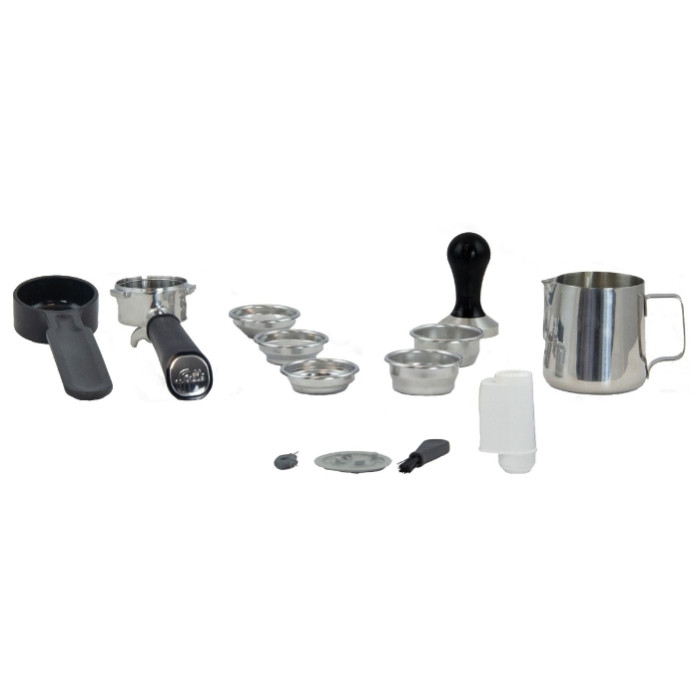 в комплекте фильтры на 1 и 2 чашки, фильтр для кофе в чалдах формата E.S.E., темпер из нержавеющей стали и кувшин для молока, мерная ложка, фильтр для воды BRITA INTENZA, тест-полоски для определения жесткости воды