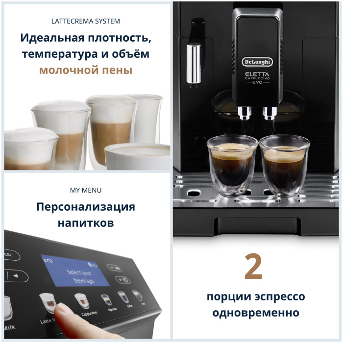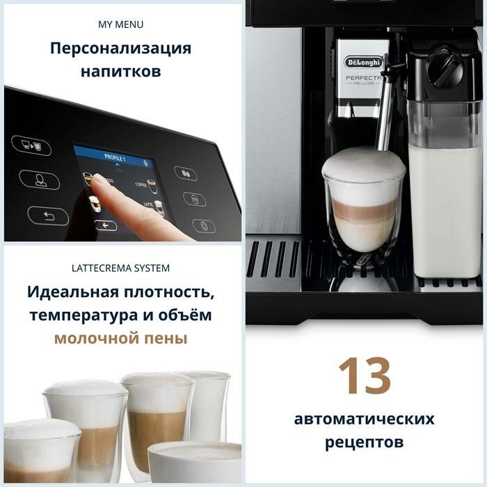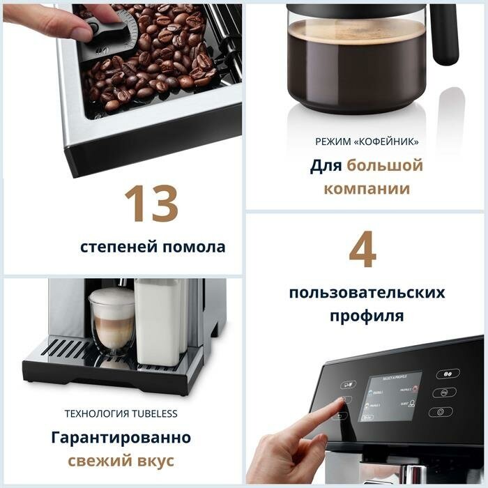 дополнительные типы напитков: кофе, лонг блэк, капучино +, горячее молоко, двойное ристретто, капучино mix, допио +; 5 уровней крепости, персональные настройки