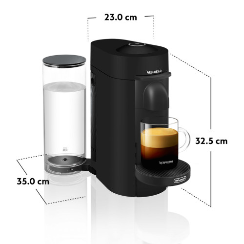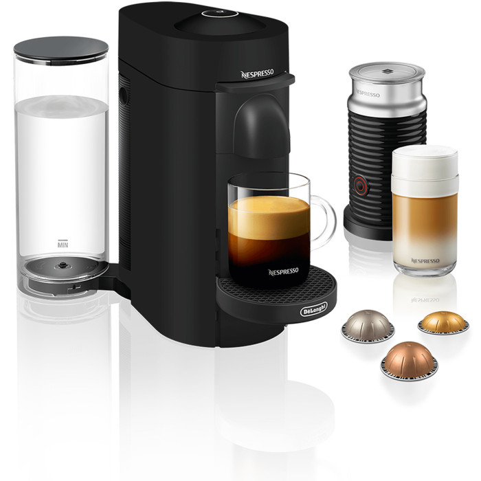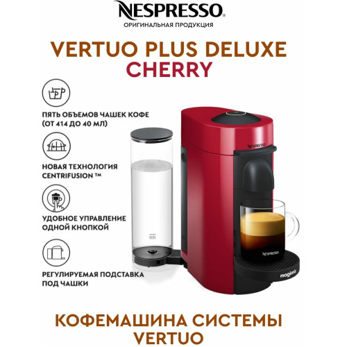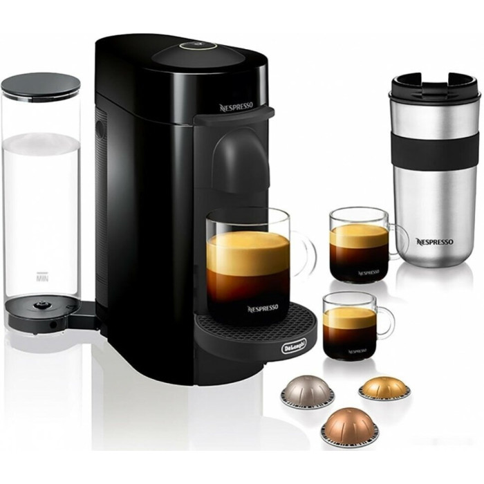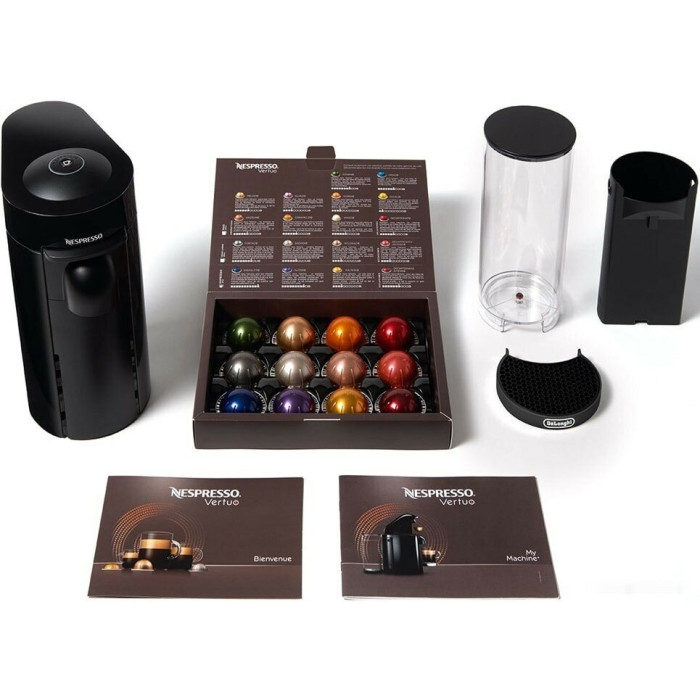 регулировка поддона по высоте; контейнер для использованных капсул 10шт.; 3 размера капсул и 5 различных объемов чашки: эспрессо (40 мл), двойной эспрессо (80 мл), гран лунго (150 мл), большая чашка (230 мл) и очень большая чашка (414 мл); система Vertuo автоматически распознает параметры приготовления кофе через штрих-код каждой кофе-капсулы