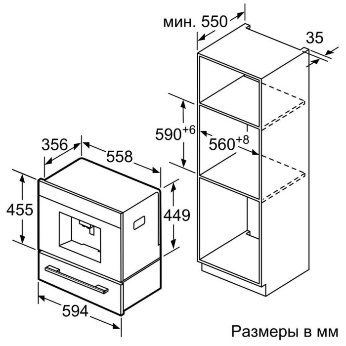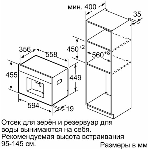 сохранение названий 8 любимых кофейных напитков с разнообразным соотношением молока и эспрессо; регулировка сопла подачи кофе и капучинатора по высоте (до 15 см); функция "блокировка от детей"; 3 уровня температуры заваривания; фильтр для воды Brita; автоматическая очистка системы; размер ниши для встраивания: 449 x 558 x 356 мм