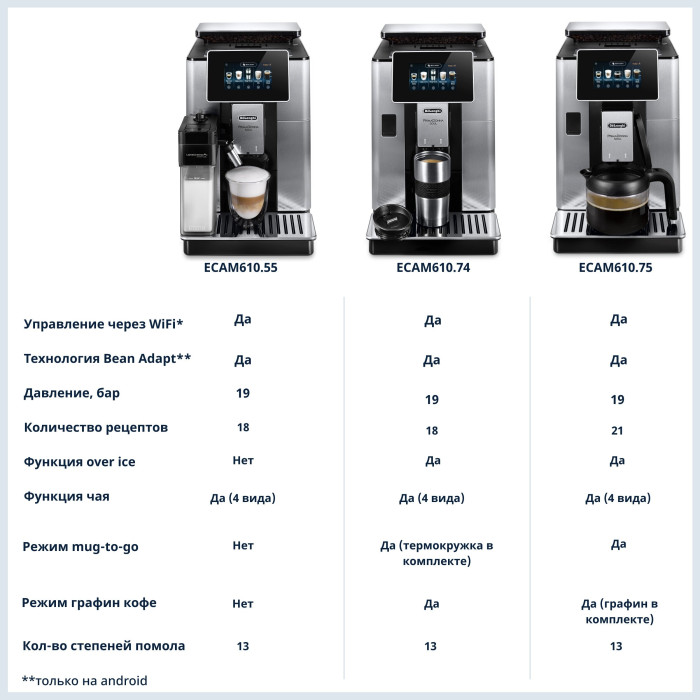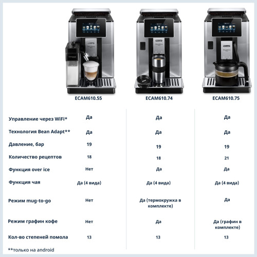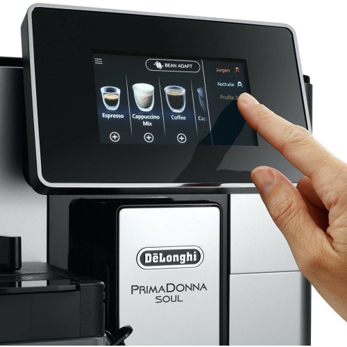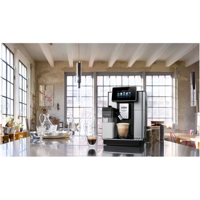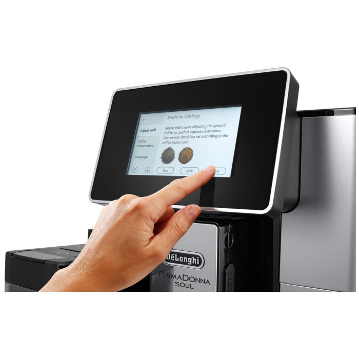 материал корпуса - металл/пластик, объем емкости для молока 0.5 л; дисплей 4,3 ", цветной TFT, сенсорная панель, тип управления: сенсорный + мобильное приложение Coffee Link App, 3 профиля; система «зерновых профилей» Bean Adapt, звуковой сигнал, встроенные часы, таймер; кофемолка жерновая, металлическая, плоско-параллельная; регулировка диспенсера по высоте, регулировка количества молочной пены, 5 уровней крепости, 18 автоматических рецептов, функция "чай", автоматическая очистка капучинатора; комплектация: средство для удаления накипи, щетка для чистки, смягчающий фильтр, мерная ложка, индикаторная полоска, узел для удаления накипи