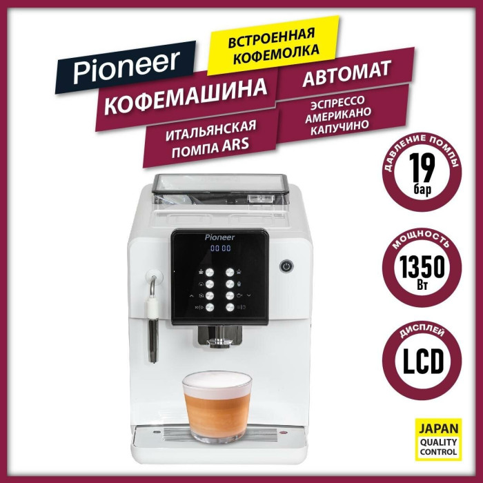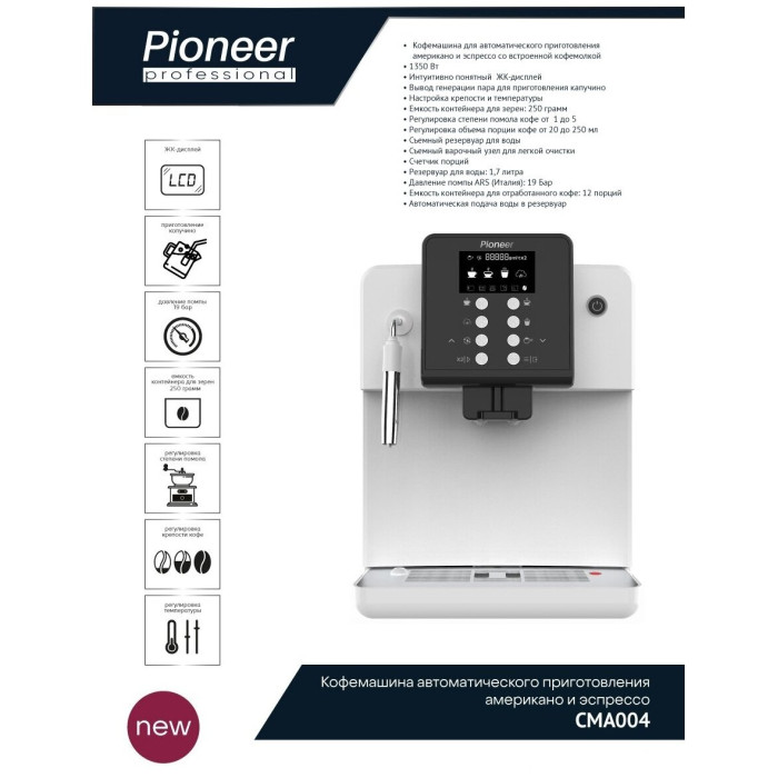 Кофемашина Pioneer CMA004 со встроенной кофемолкой, LCD-дисплеем и итальянской помпой ARS идеально подходит для автоматического приготовления американо и эспрессо, а также капучино. Наша стильная, простая в использовании кофемашина сохранит Ваши драгоценные утренние минуты и станет правильным выбором для дома или офиса.
