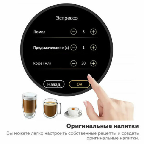 Тип: автоматическая; Тип устройства: кофемашина; Тип используемого кофе: молотый / зерновой; Тип напитка: американо, капучино, латте, эспрессо; Тип управления: электронное; Мощность: 1450 Вт; Объем: 1.5 л; Емкость контейнера для зерен: 200 г;