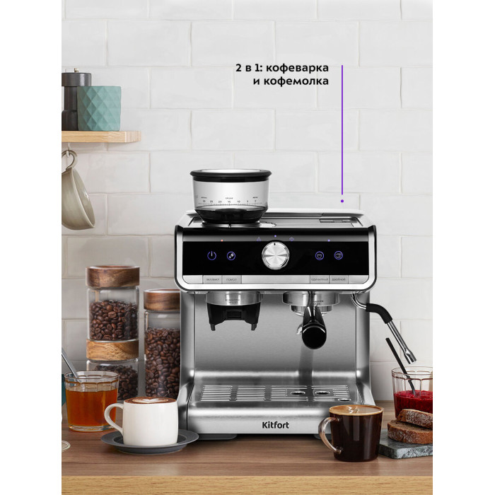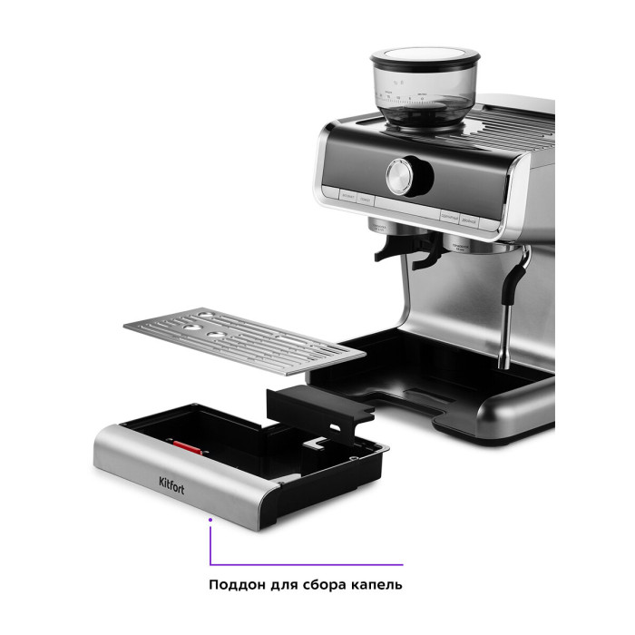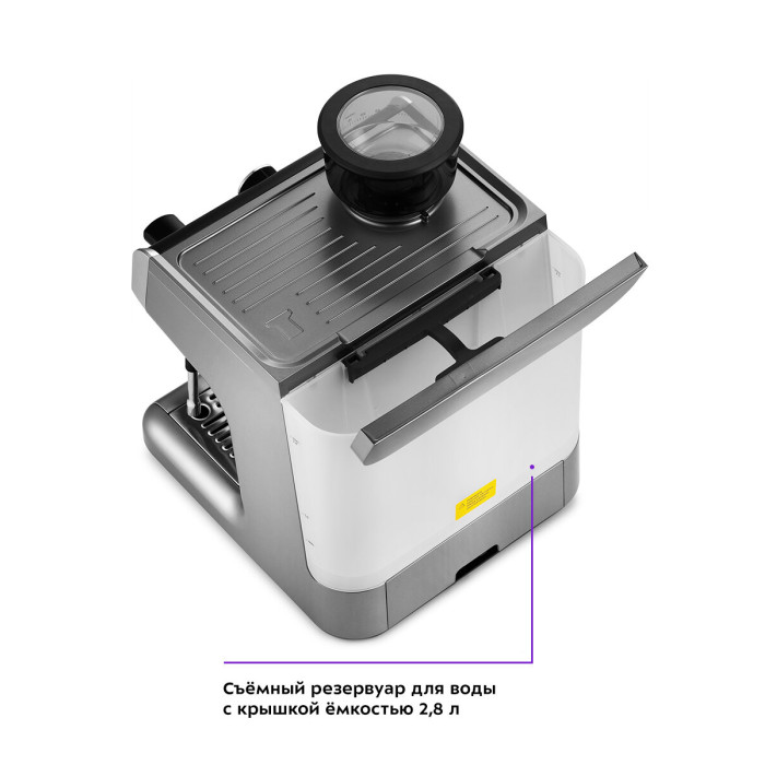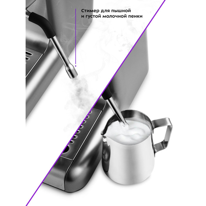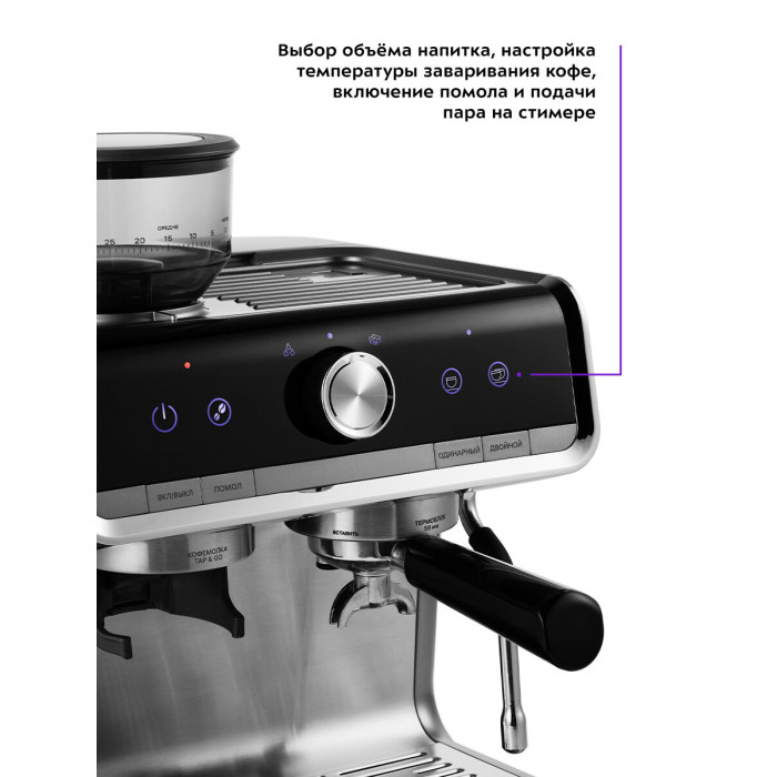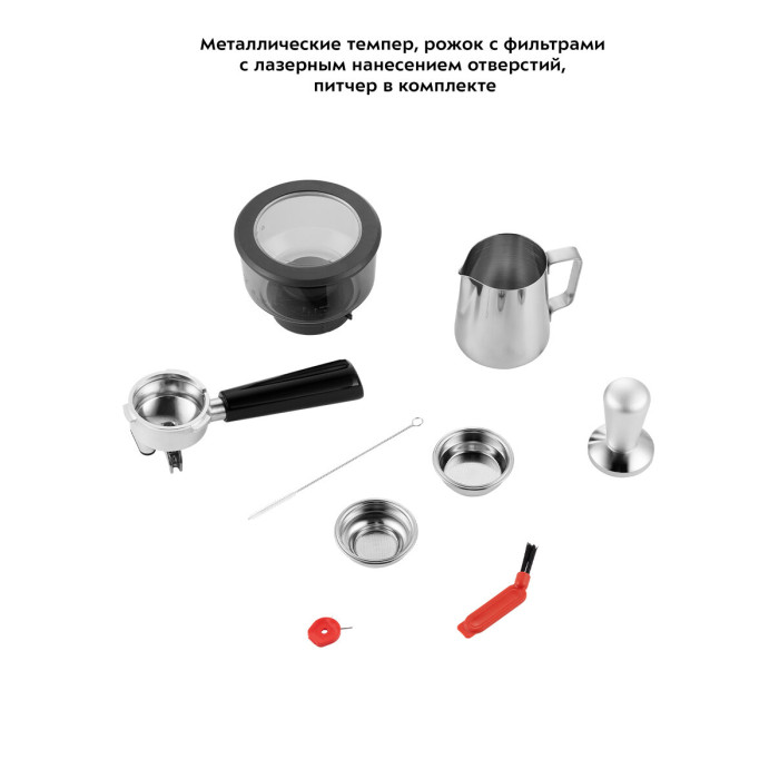 Комплектация 1. Кофеварка — 1 шт. 2. Резервуар для воды — 1 шт. 3. Поддон для капель со съемной решеткой — 1 шт. 4. Рожок — 1 шт. 5. Резервуар для кофейных зерен — 1 шт. 6. Крышка резервуара для кофейных зерен — 1 шт. 7. Фильтр — 1 шт. 8. Питчер — 1 шт. 9. Одинарный фильтр (single) — 1 шт. 10. Двойной фильтр (double) — 1 шт. 11. Металлический темпер — 1 шт. 12. Поддон для инструментов — 1 шт. 13. Щетка для чистки — 1 шт. 14. Игла для чистки — 1 шт. 15. Руководство по эксплуатации — 1 шт. 16. Коллекционный магнит — 1 шт.* *опционально