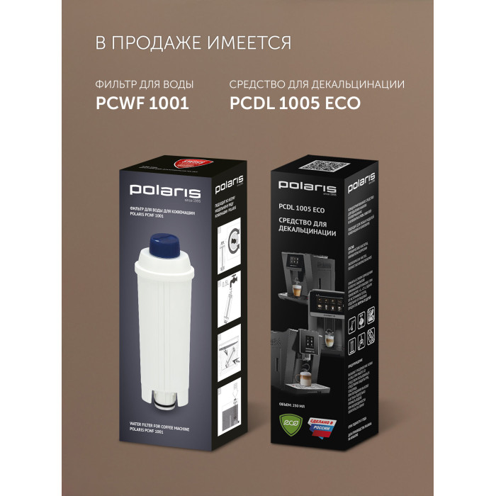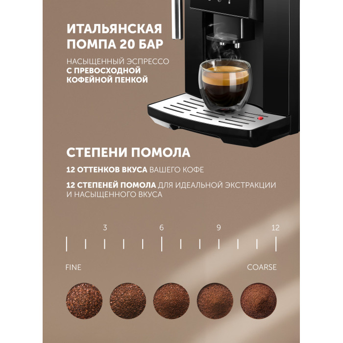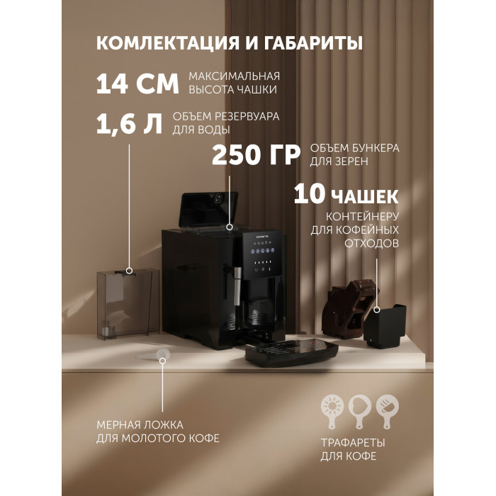 Комплектация: Кофемашина, трафареты, кисточка для очистки заварочного узла, гарантийный талон, инструкция, мерная ложка