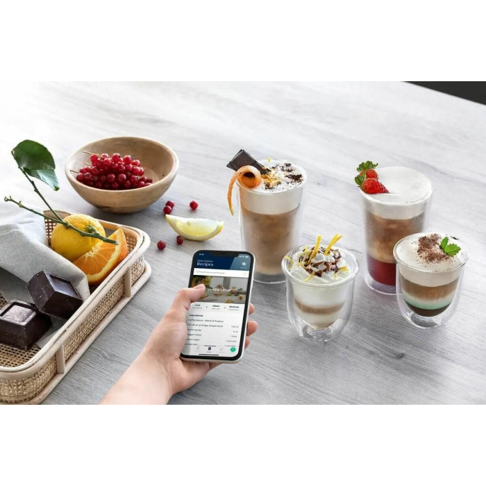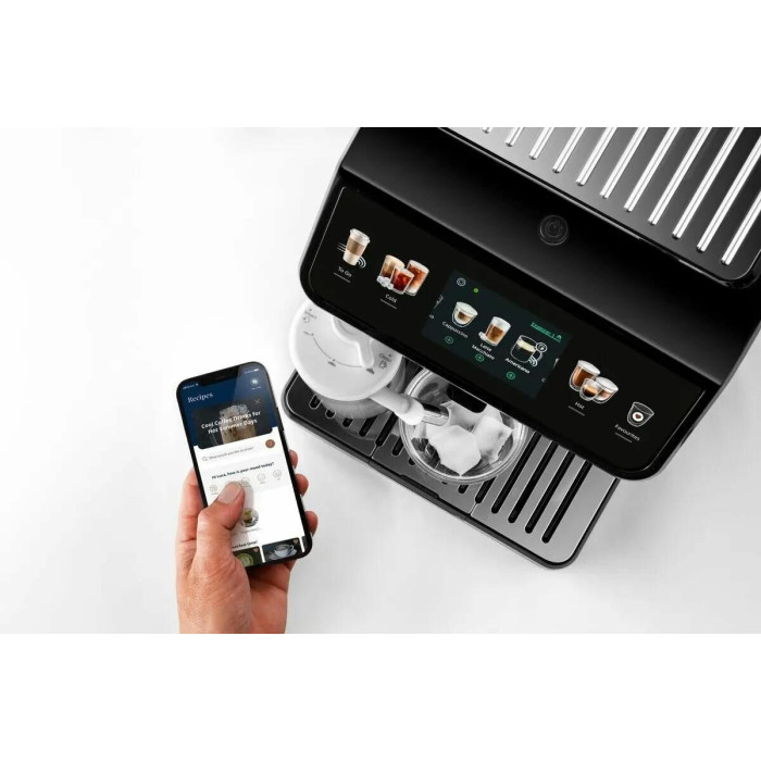 система горячего и холодного молока Latte crema, красочный дисплей 3.5 TFT с мягким сенсорным управлением, управление через мобльное приложение, два контейнера для молока: Latte Crema Hot и Latte Crema Cool, 4 индивидуальных профиля; кофемолка жерновая, металлическая, коническая