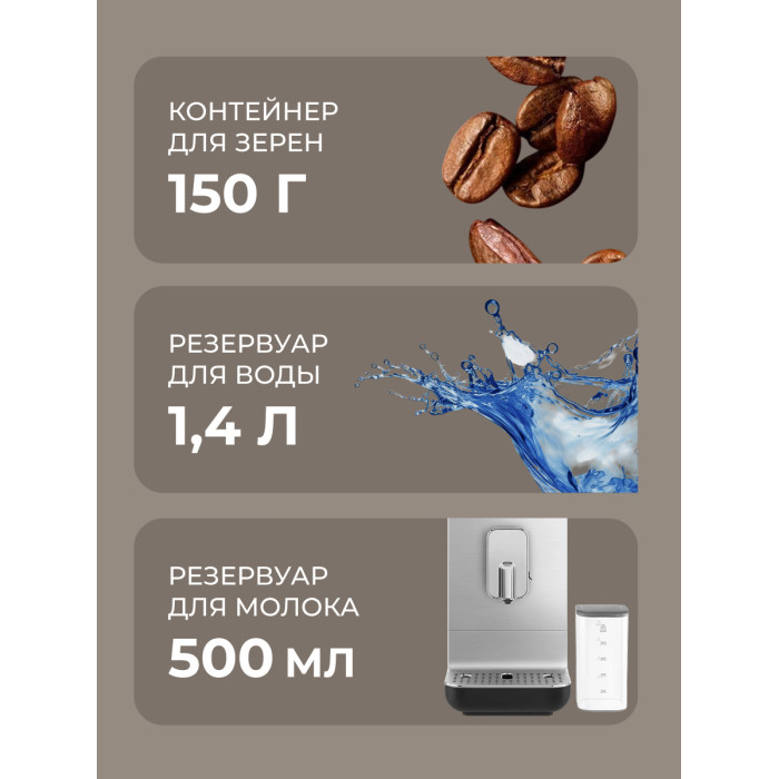Автоматическое вспенивание молока; Индикация заполнения отсека для отходов; Автоматическая установка жесткости воды; Механическая установка жесткости воды; Съемный резервуар для воды; В комплекте: контейнер для молока, съемный лоток для использованного кофе, съемный лоток для сбора капель