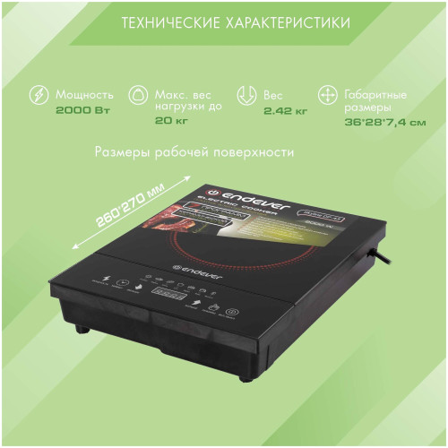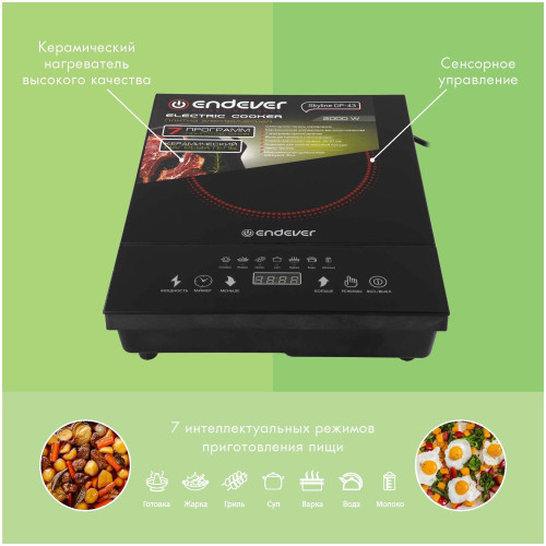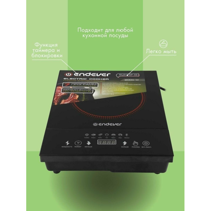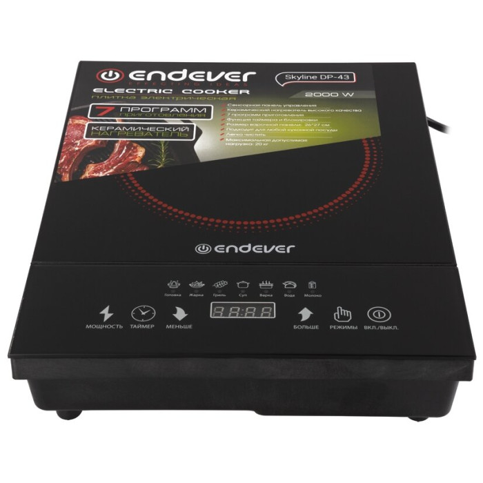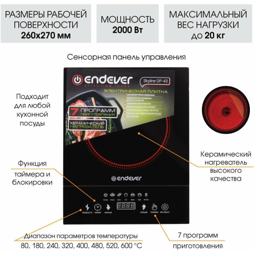 Электрическая плита ENDEVER Skyline DP-43 – аппарат лёгкий и компактный, это отличный помощник на маленьких кухнях, на дачах и других домах загородом. Благородный черный корпус с варочной поверхностью из прочной стеклокерамики класса «Черный хрусталь» способна выдержать до 15 кг нагрузки.