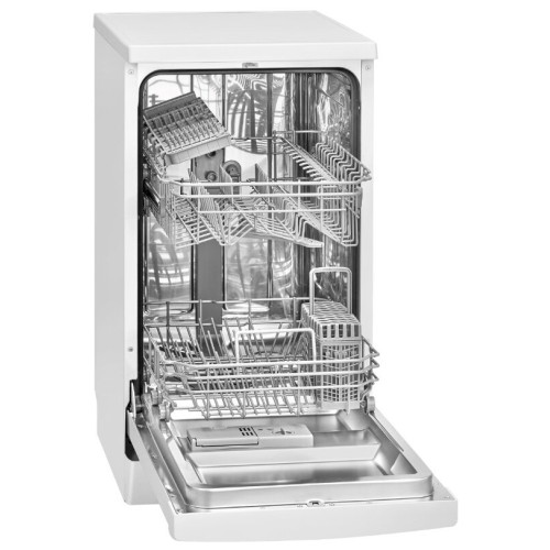 тип установки: отдельно стоящая, тип: узкая, ширина: 44.80 см, высота: 85 см, глубина: 61 см, безопасность: защита от детей, защита от протечек, программы: экономичная, интенсивная, стандартная, стекло, режим половинной загрузки, режим ополаскивания, вместимость: 10 комплектов, особенности: дисплей, регулируемая по высоте корзина для посуды, внутренняя поверхность из нержавеющей стали, таймер отсрочки, автоматическая установка жесткости воды
