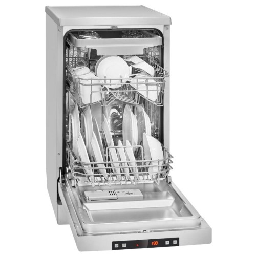 тип установки: отдельно стоящая, тип: узкая, ширина: 44.80 см, высота: 84.50 см, глубина: 60 см, безопасность: защита от детей, защита от протечек, программы: быстрая, интенсивная, режим половинной загрузки, стандартная, стекло, экономичная, вместимость: 10 комплектов, особенности: автоматическая установка жесткости воды, внутренняя поверхность из нержавеющей стали, дисплей, регулируемая по высоте корзина для посуды, таймер отсрочки