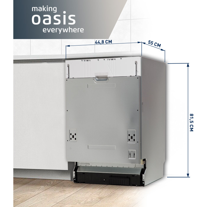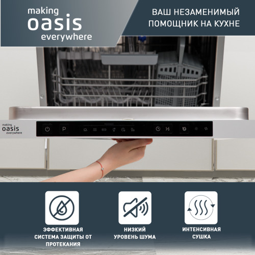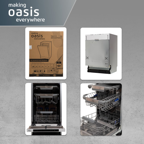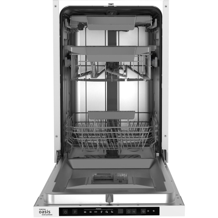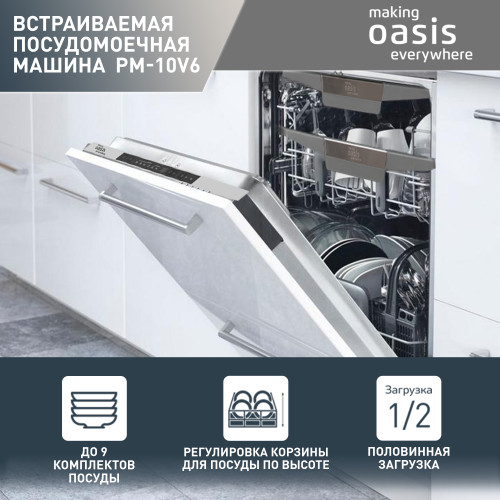 Встраиваемая посудомоечная машина 45см making OASIS everywhere PM-10V6 белый (3 корз, пр-во Midea). Встраиваемая посудомоечная машина способна эффективно очистить от загрязнений за один цикл до 10 комплектов кухонной посуды. Модели характеризуется низким уровнем расхода воды и электроэнергии, что способствует комфорту эксплуатации. Пользователь может самостоятельно настраивать температурный режим, выбирать оптимальную программу и регулировать другие параметры работы устройства. За счет эффективной системы защиты предотвращаются любые протечки при работе устройства.