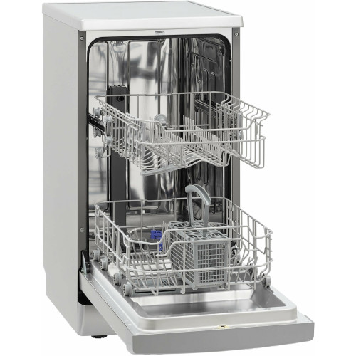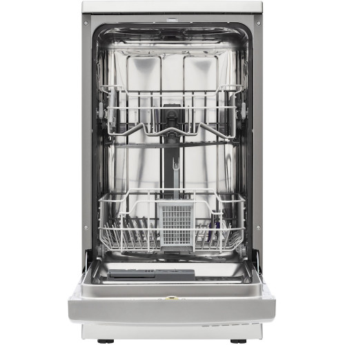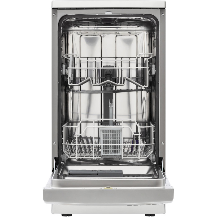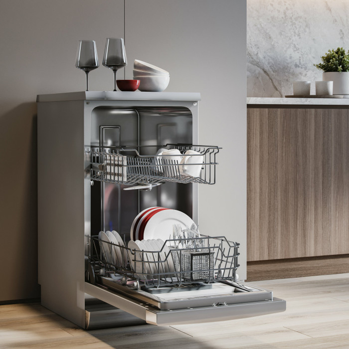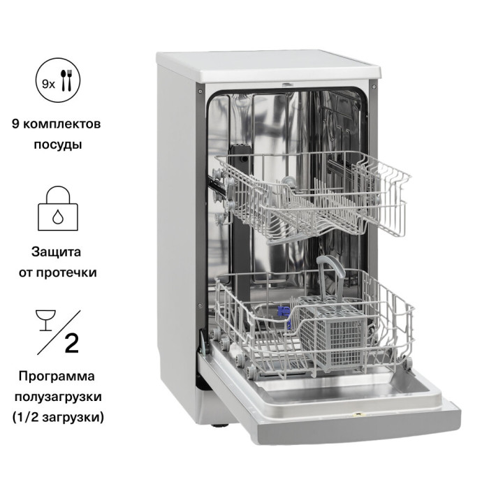 Отдельностоящая посудомоечная машина шириной 45 см вмещает 9 комплектов посуды. Для удобства использования в модели предусмотрен режим половинной загрузки, который позволяет экономить расход воды, таймер отложенного старта, а также возможность регулировки верхней корзины по высоте, что позволяет удобно загружать и мыть посуду разных размеров.