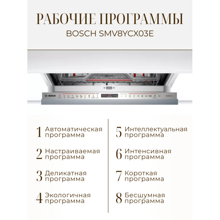 Посудомоечная машина Bosch SMV8YCX02E – это надежный и практичный помощник, который сделает вашу жизнь проще и комфортнее.