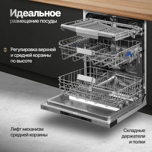 внутренняя поверхность из нержавеющей стали, использование средств 3 в 1, подсветка камеры, регулируемая по высоте корзина для посуды, таймер отсрочки