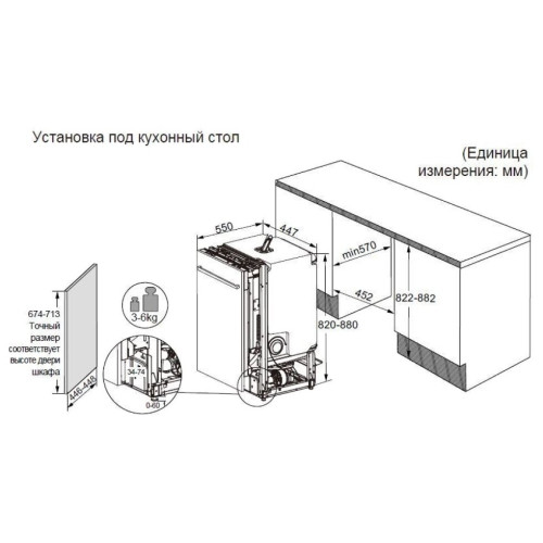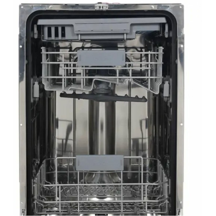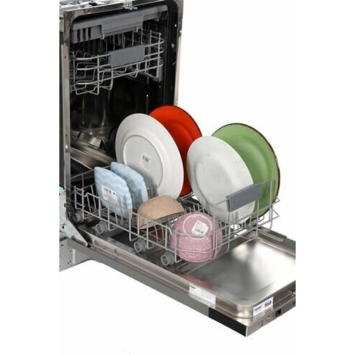 Общие данные: Габариты: 82x44.7x55 см Кол-во комплектов посуды: 10 Управление: электронное Класс мытья: А Класс сушки: A Класс энергопотребления: А+ Уровень шума: 49 дБ Программы: Авто Интенсивная Эко Дезинфекция Половинная загрузка Дополнительные функции: Внутреннее освещение Луч на полу Отсрочка старта, ч: 1 - 12 Электронные индикаторы отсутствия соли и ополаскивателя Безопасность: Система защиты от протечек Aquastop Система защиты от перелива Блокировка от детей Дополнительная информация: Переставляемая по высоте корзина Складные держатели тарелок Полочка для чашек в вернем коробе Количество разбрызгивателей: 3 Ручка корзины Регулировка высоты: 4 ножки, до 6 см Материал бака: нержавеющая сталь Материал микро фильтра: нержавеющая сталь Номинальное напряжение / частота: 220-240В/50 Гц Мощность подключения: 1750~2060 Вт Потребление электроэнергии, кВт/г: 238 Параметры расхода воды, л/г: 2800 Расход воды за цикл, л: 10 Декоративная панель (при наличии на фото) в комплектацию встраиваемой посудомоечной машины не входит! Данное фото носит информативный характер.