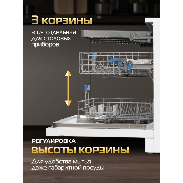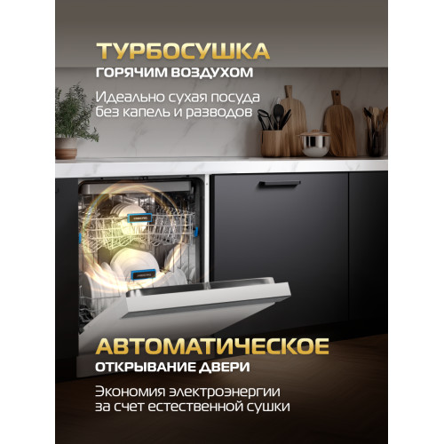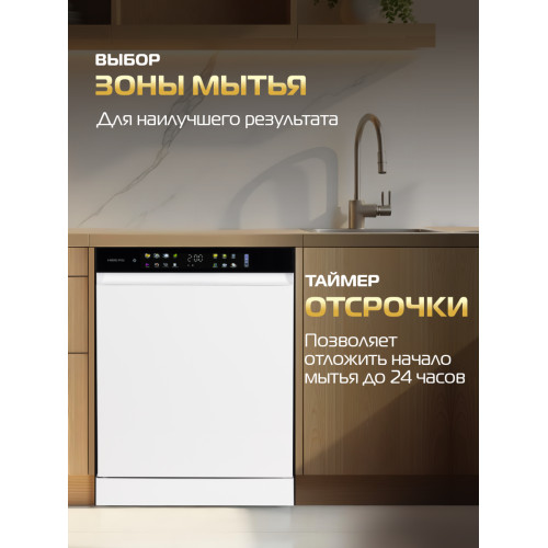 Половинная загрузка, выбор зоны мытья, цветной сенсорный дисплей, функция "Длительное хранение", выбор интенсивности мытья, горячая сушка, программа Уход за машиной. Программа Турбосушка