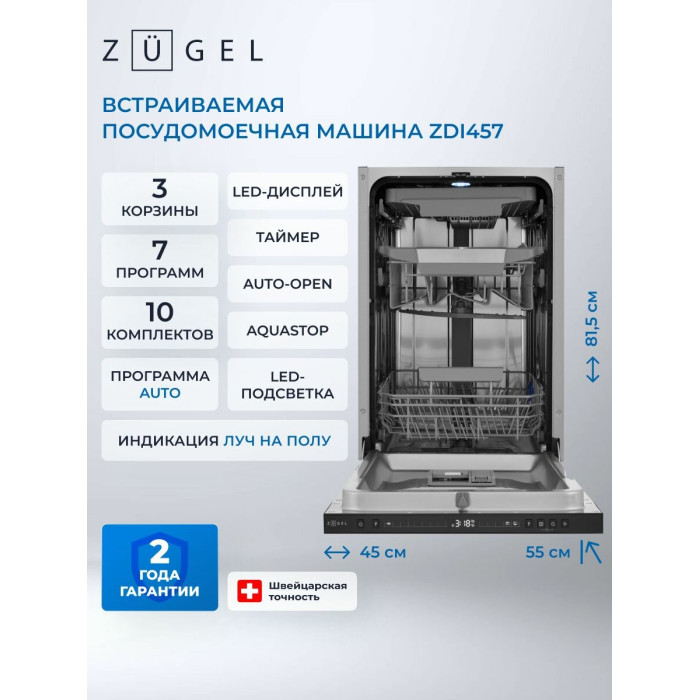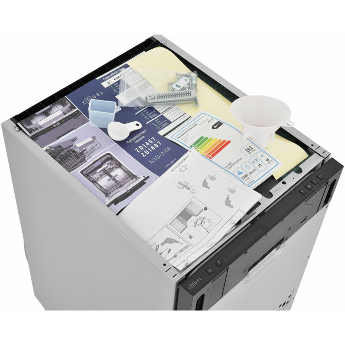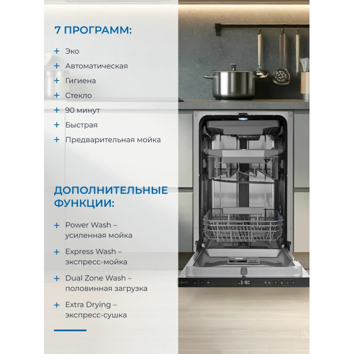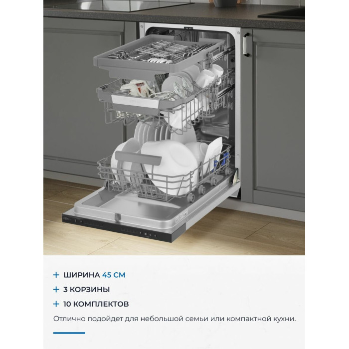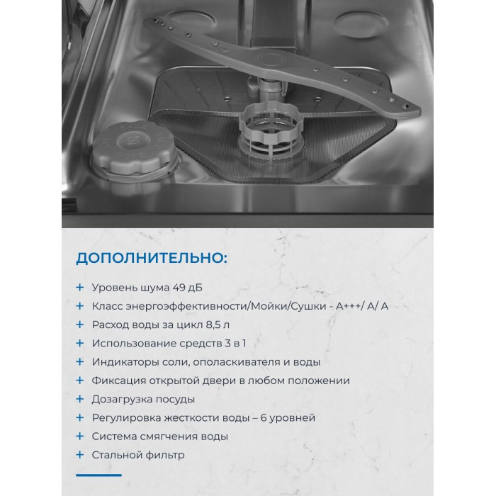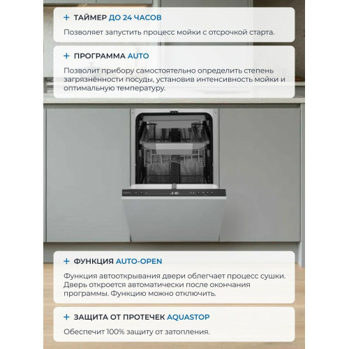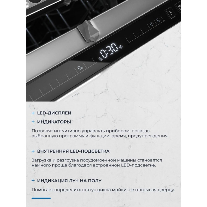 дисплей, использование средств 3 в 1, Автоматическое открывание двери, Внутреннее освещение, Возможность добавления посуды после запуска, Отключение звукового сигнала, Отсрочка запуска, Поддон для столовых приборов, Полка для чашек, Таймер