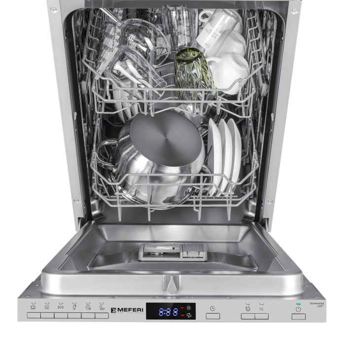 внутренняя поверхность из нержавеющей стали, дисплей, использование средств 3 в 1, регулируемая по высоте корзина для посуды, таймер отсрочки