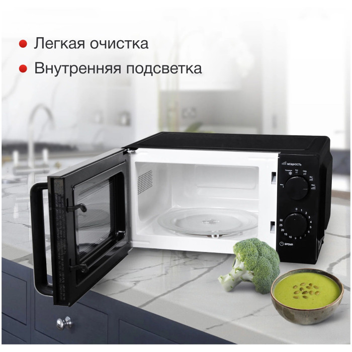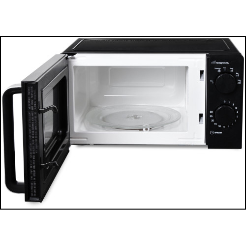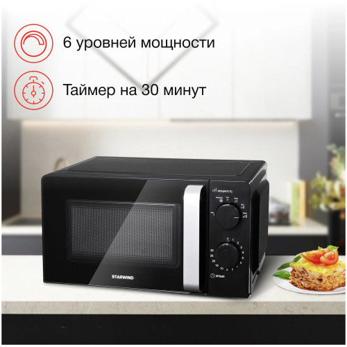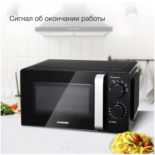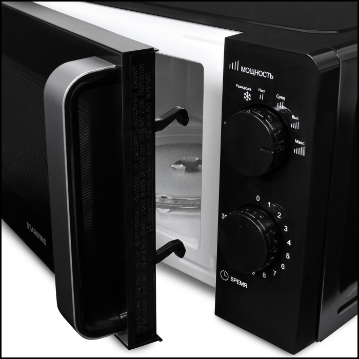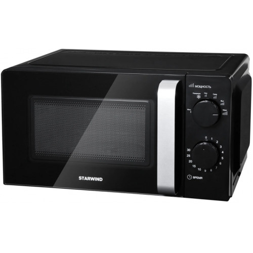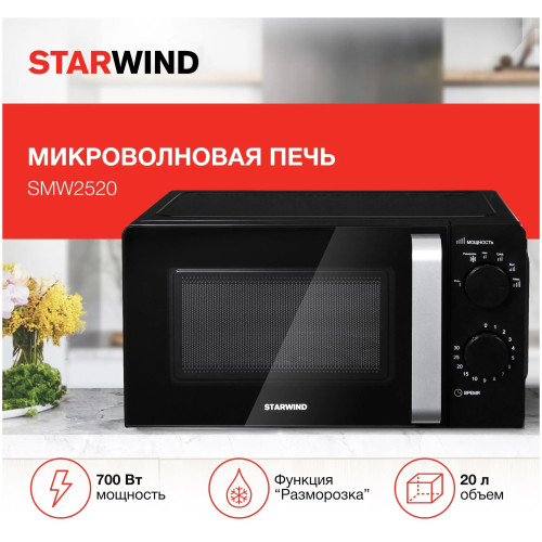 Микроволновая печь STARWIND SMW2520 – это универсальный помощник, который не только позволит вам справиться с ежедневными задачами разогрева пищи, но позволит с разы быстрее приготовить стандартные блюда, среди которых: творожная запеканка, яблочное пюре, овощи, буженина и многое другое, главное, правильно настроить мощность и выбрать время приготовления. Дверца печи выполнена из жаропрочного стекла, предотвращающего нагревание внешних поверхностей. В центре дверцы находится специальное окошко, позволяющее наблюдать за процессом приготовления. Чтобы открыть дверь необходимо просто потянуть за ручку, расположенную на самой двери. Внутренний полезный объем составляет 20 литров. Корпус выполнен из металла, а на задней стенке расположены перфорированные отверстия, выводящий с помощью вентиляторов горячий воздух, вырабатывающийся в процессе готовки или разогрева, чтобы микроволновая печь не перегревалась. Максимальная производительность данной модели составляет 700 Вт. Управление – механическое, поэтому регулируется мощность с помощью ручки-переключателя, расположенной вверху справа от дверцы. Всего представлено 4 режима регулировки мощности: максимальная, высокая, средняя и низкая и один режим «разморозки». Для выбора времени работы прибора необходимо повернуть ручку-переключатель по направлению движения часовой стрелки и выставить указатель на необходимо время.
