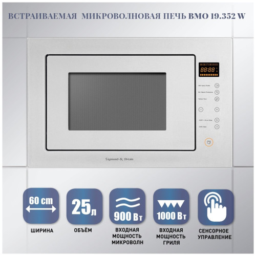 расположение: встраиваемая, объем: 25 л, переключатели: сенсорные, мощность микроволн: 900 Вт, внутреннее покрытие камеры: нерж. сталь, ширина: 60 см, высота: 38.50 см, режимы работы: гриль, микроволны + гриль, дополнительные режимы: автоматическая разморозка, звуковой сигнал отключения, диаметр поддона: 315 мм, особенности: дисплей, подсветка камеры, блокировка от детей