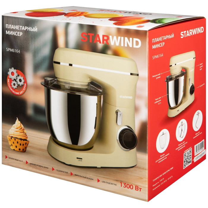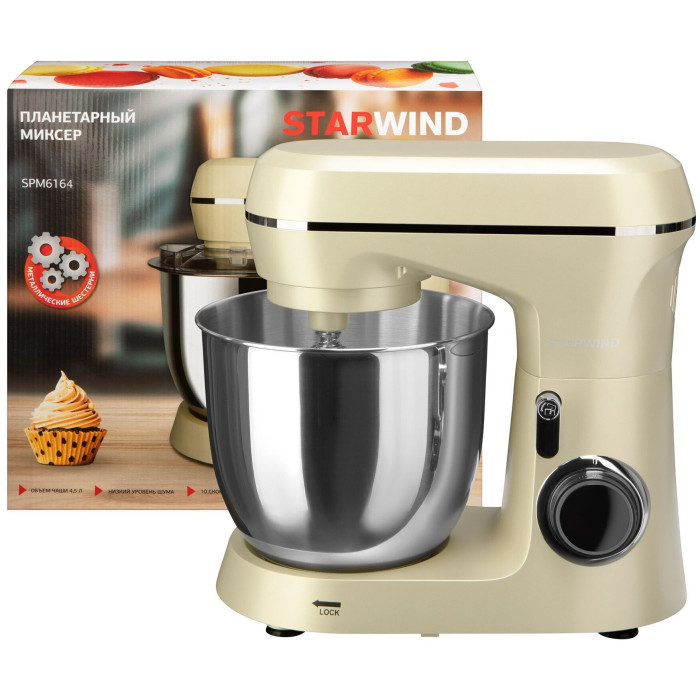 тип: стационарный, мощность: 1300 Вт, насадки: венчик для взбивания, крючки для замешивания теста, лопатка, количество насадок: 3, объем чаши: 4.50 л
