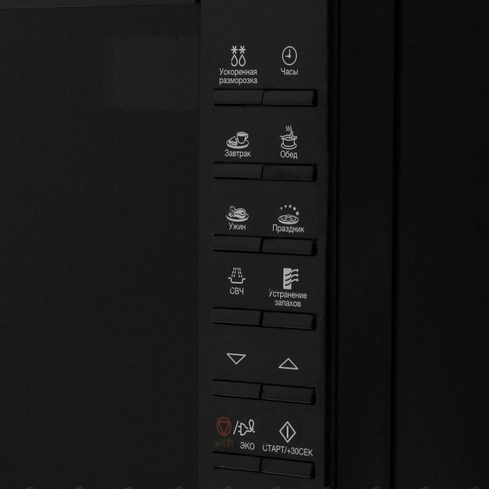 блокировка от детей, дисплей, кнопка +30 секунд, отключение звукового сигнала, подсветка камеры, система равномерного распределения микроволн, функция задержки пуска, блокировка от детей, часы, режим разморозки