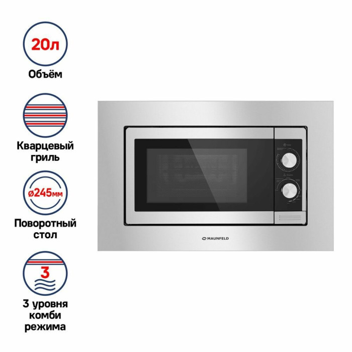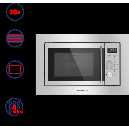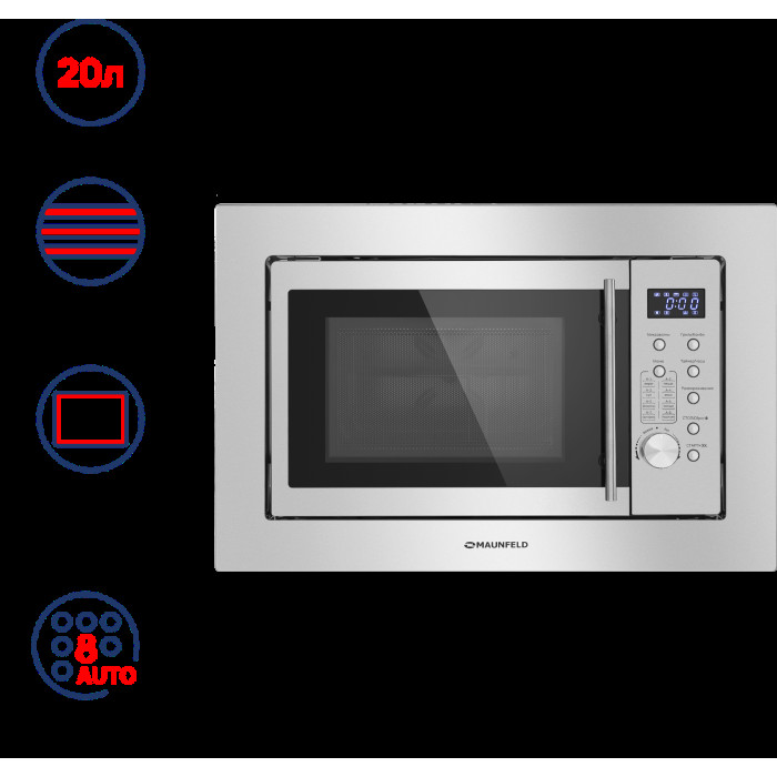 Микроволновая печь Maunfeld XBMO202S — это встраиваемая выполненная из вороненной стали. Внутреннее покрытие камеры полностью из нержавеющей стали AISI 304, толщиной 0.9 мм, которая легко переносит механические воздействия, имеет высокие показатели прочности, надежности и долговечности. Есть функция размораживания по весу и времени, а также тэновый гриль.