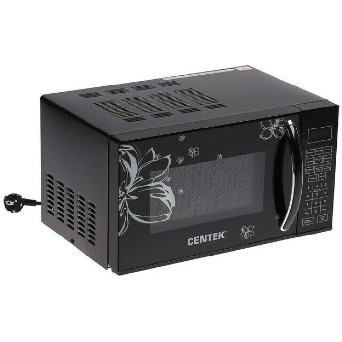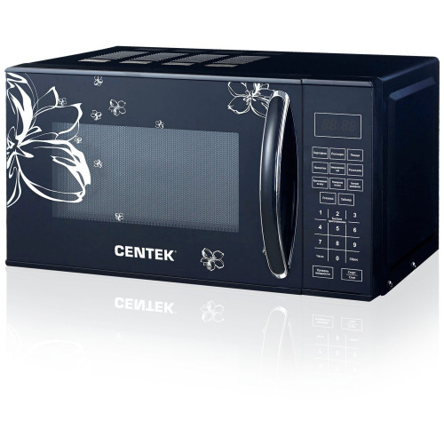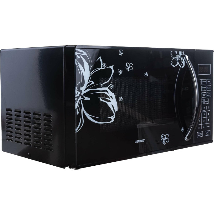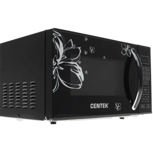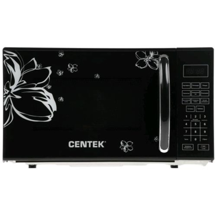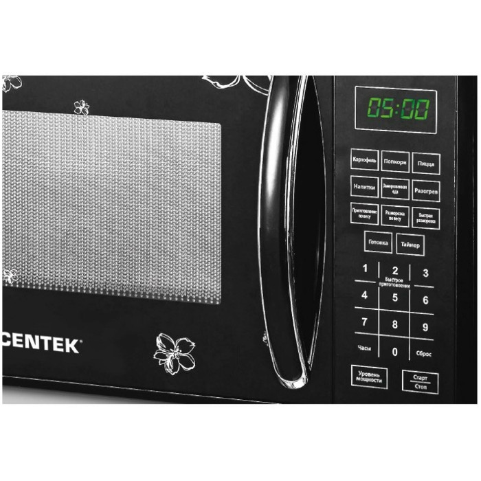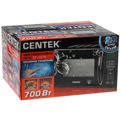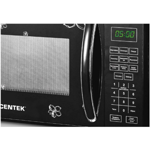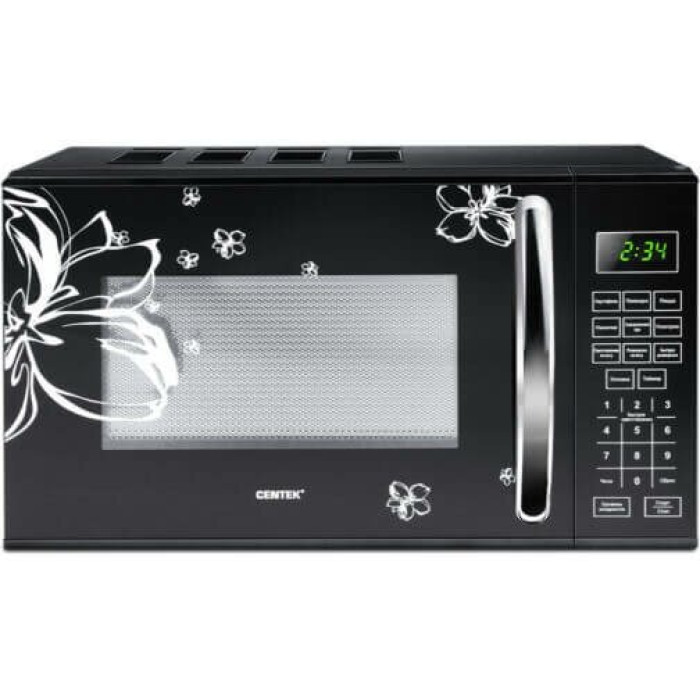 Микроволновая печь Centek CT-1579 представлена в интересном с точки зрения стилистики корпусе: представленную в черном цвете, модель украшают белоснежные цветы. Вместительность микроволновки составляет 20 л, в свою очередь, ее мощность равна 700 Вт. Диаметр поддона 24.5 см позволяет помещать внутри печи достаточно большую посуду. Размер микроволновки составляет 45.5x36x26.5 см, что делает ее очень вместительной.