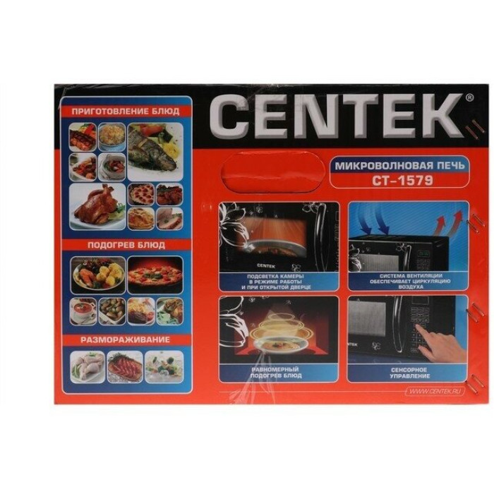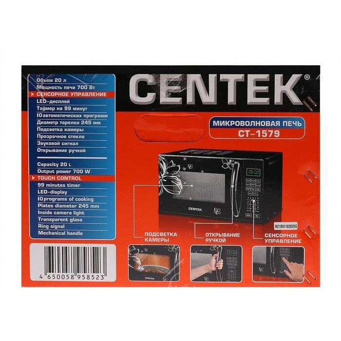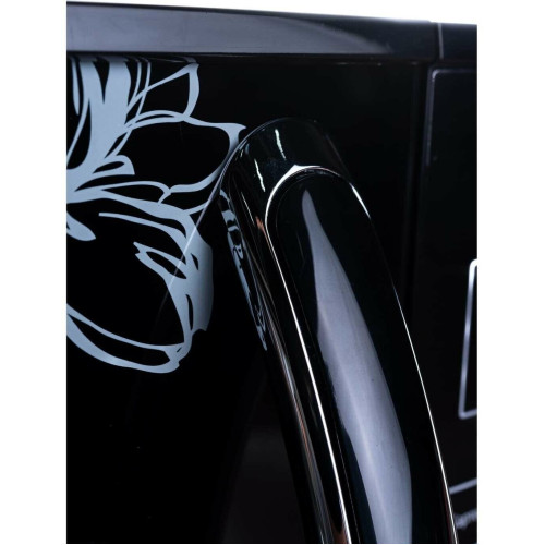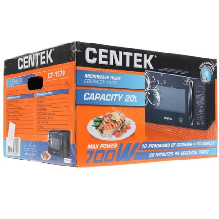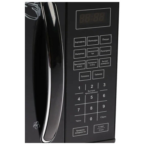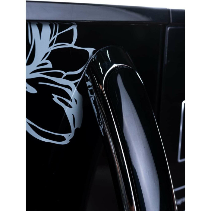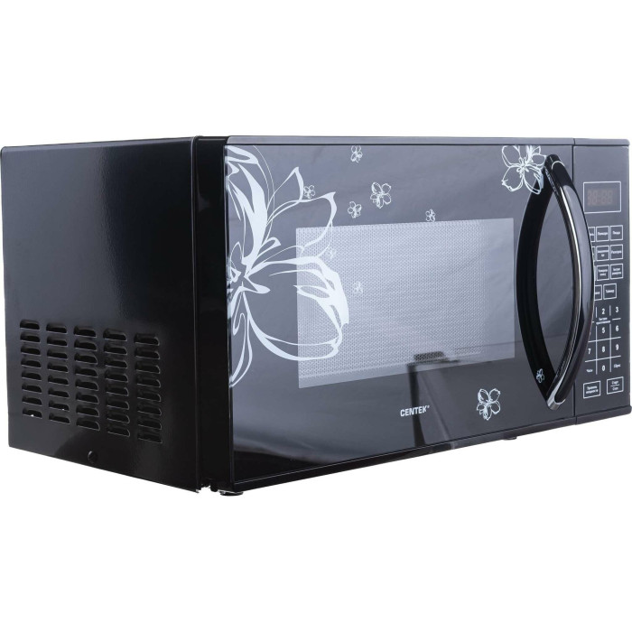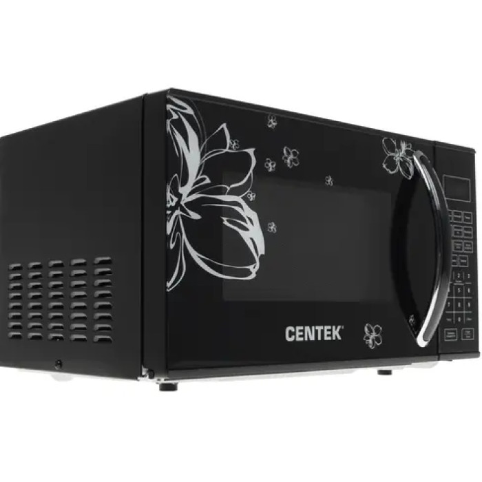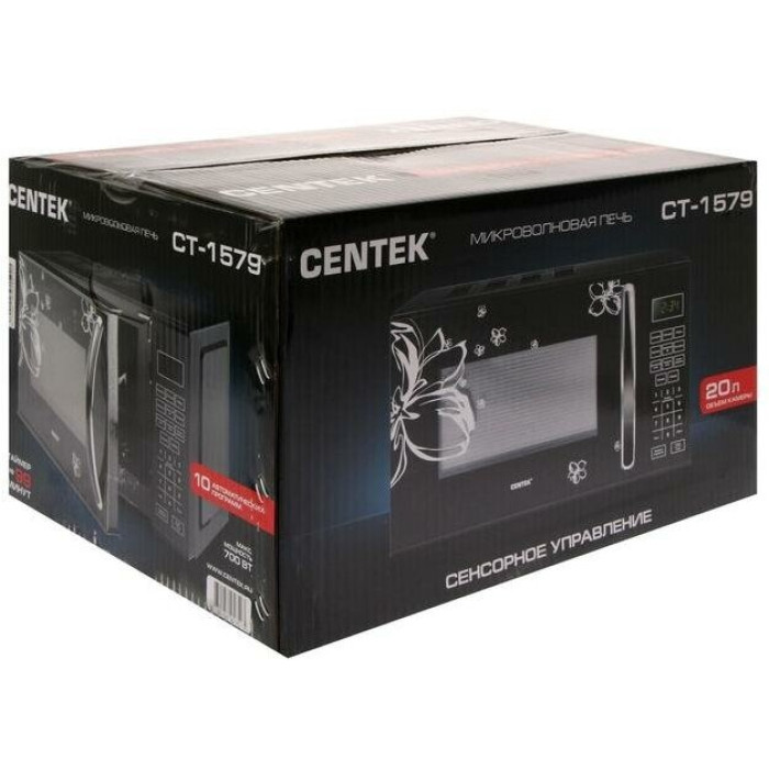 Микроволновая печь Centek CT-1579 представлена в интересном с точки зрения стилистики корпусе: представленную в черном цвете, модель украшают белоснежные цветы. Вместительность микроволновки составляет 20 л, в свою очередь, ее мощность равна 700 Вт. Диаметр поддона 24.5 см позволяет помещать внутри печи достаточно большую посуду. Размер микроволновки составляет 45.5x36x26.5 см, что делает ее очень вместительной.
