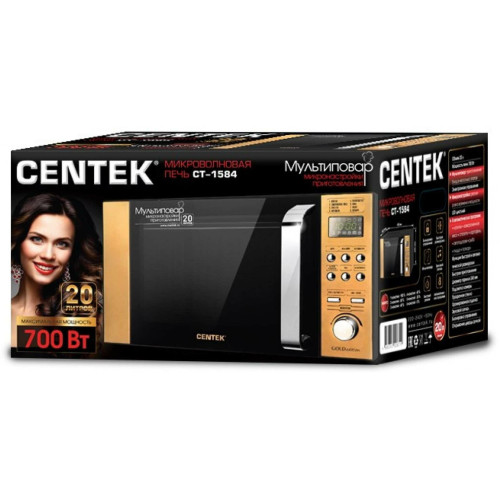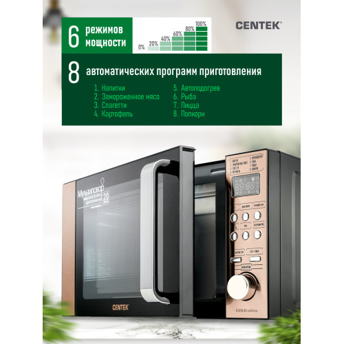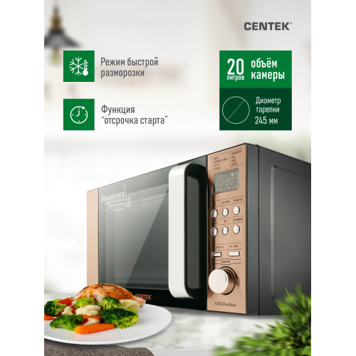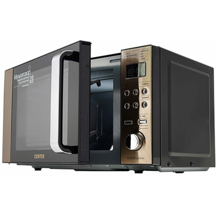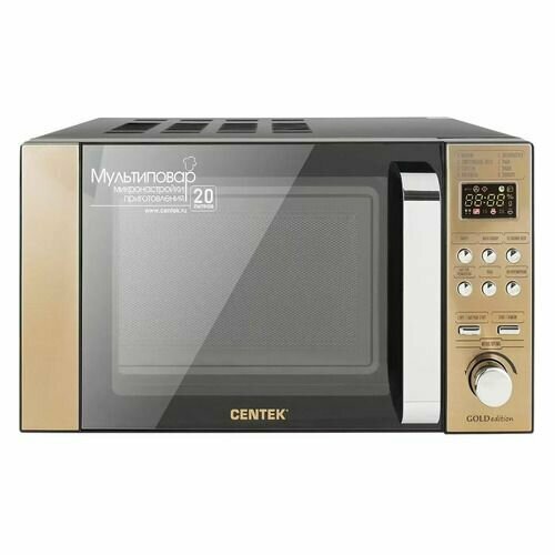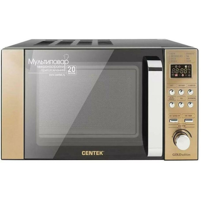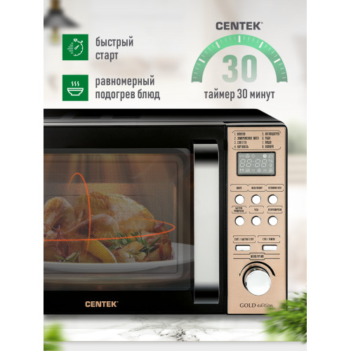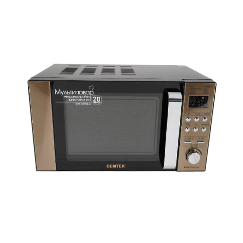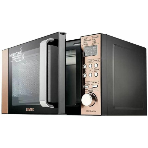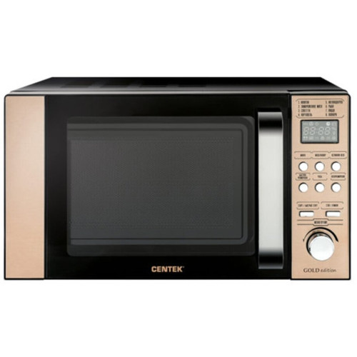 Микроволновая печь **CENTEK** CT-1584 - это надежный и удобный прибор, который станет незаменимым помощником на кухне. Она имеет элегантный дизайн и выполнена в черном цвете с золотыми элементами, что придает ей особый шарм.