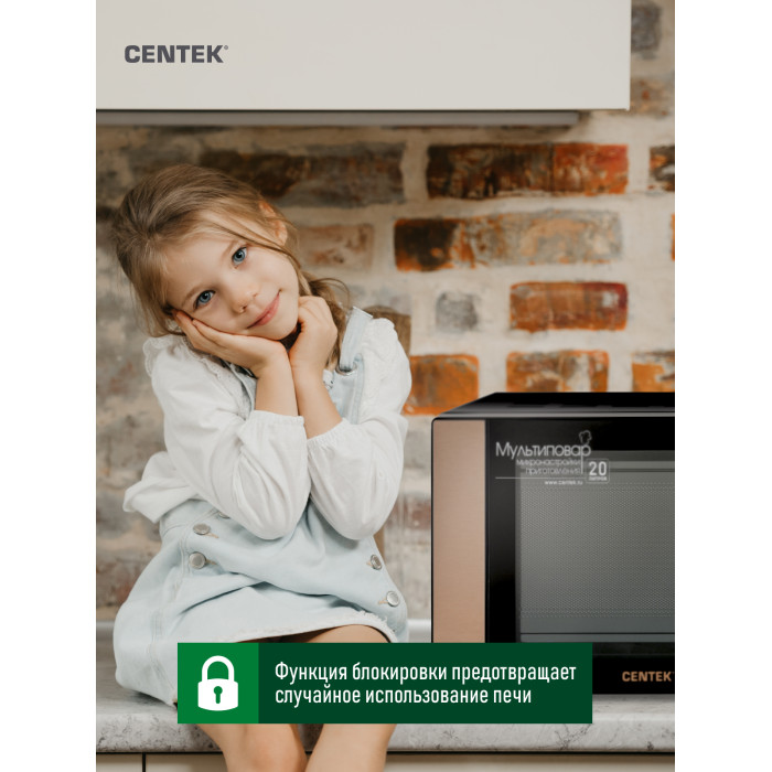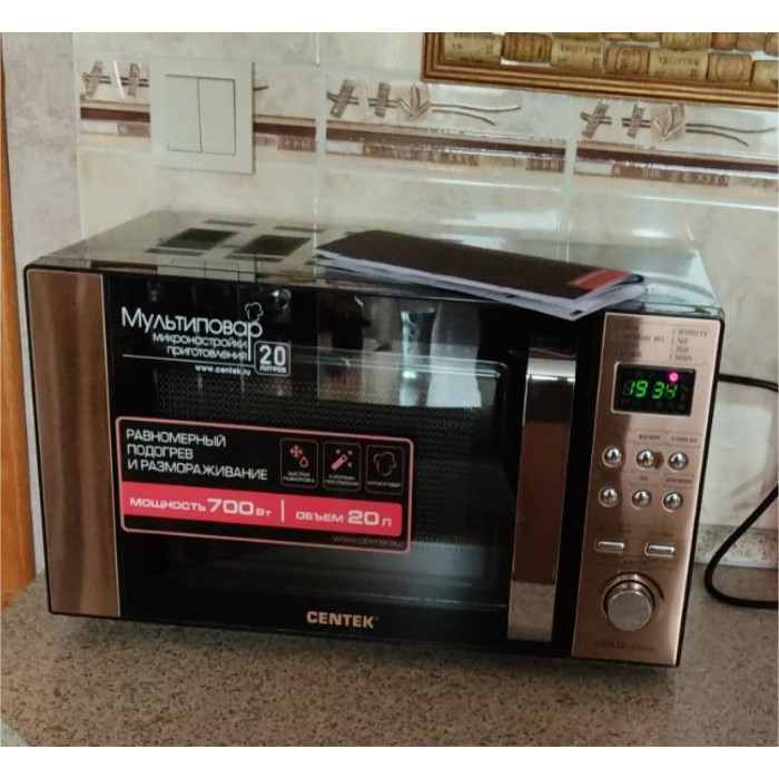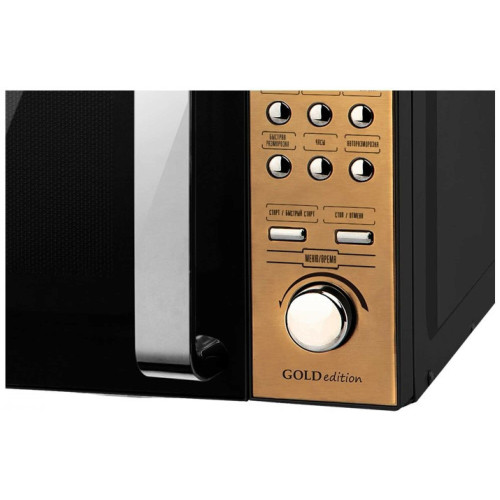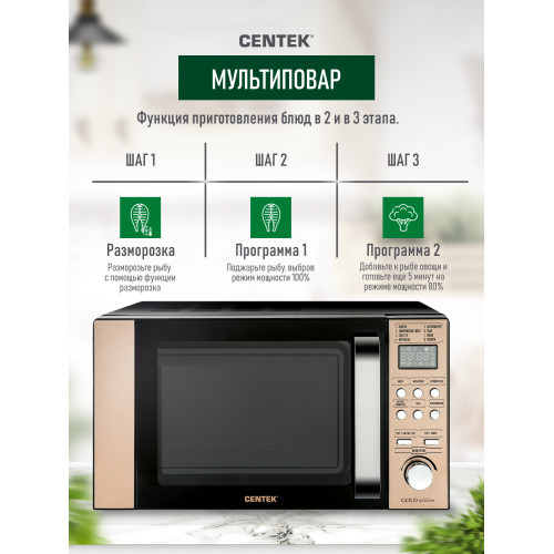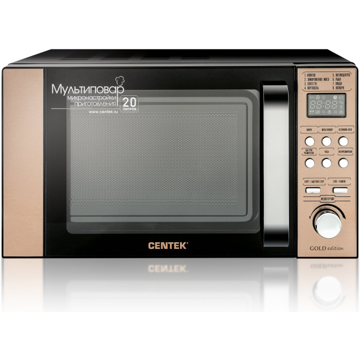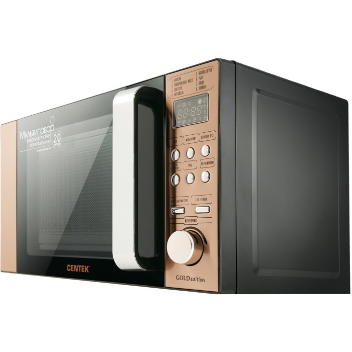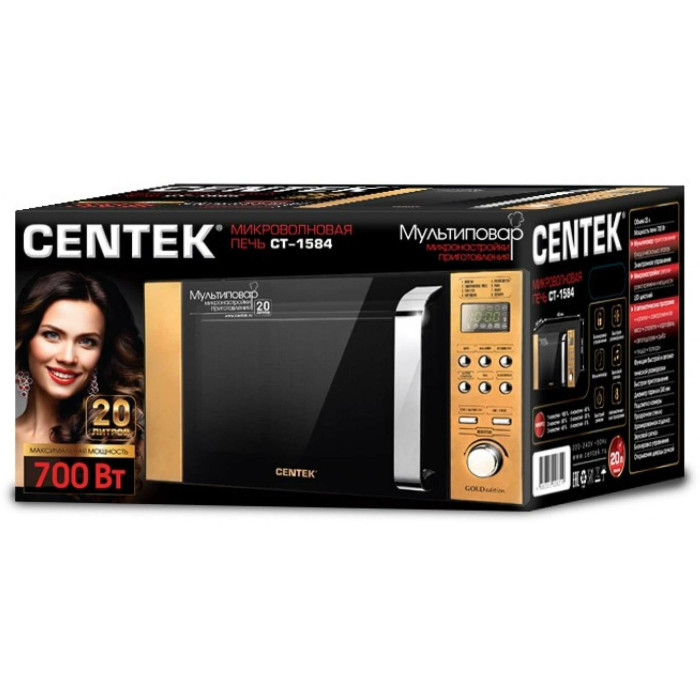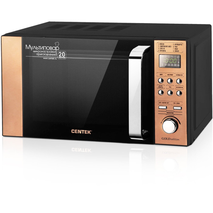 Микроволновая печь **CENTEK** CT-1584 - это надежный и удобный прибор, который станет незаменимым помощником на кухне. Она имеет элегантный дизайн и выполнена в черном цвете с золотыми элементами, что придает ей особый шарм.