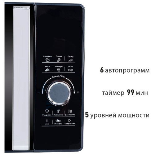 Микроволновая печь PIONEER MW358S черный, 23 л, 800 Вт, гриль, электронное управление, переключатели: сенсорные, кнопки, ручка, дисплей, уровней мощности: 5