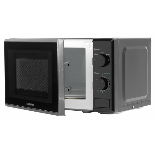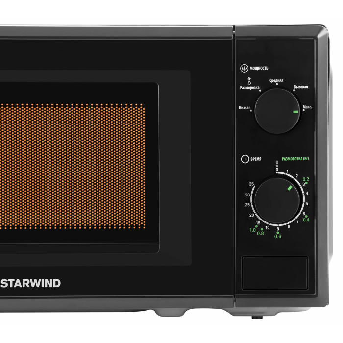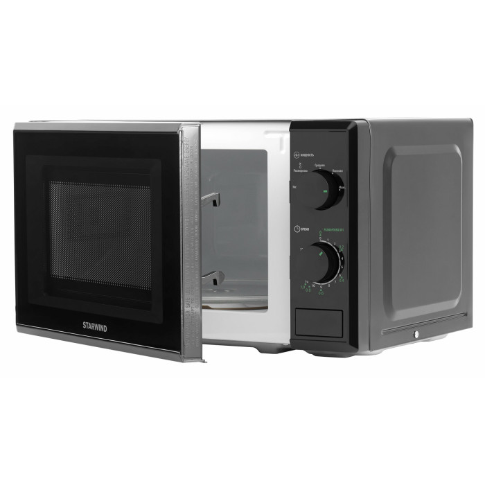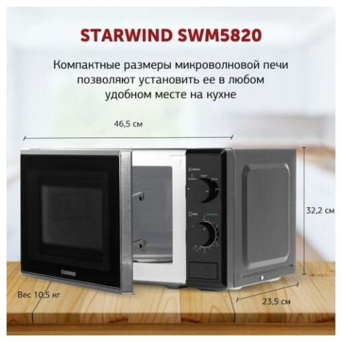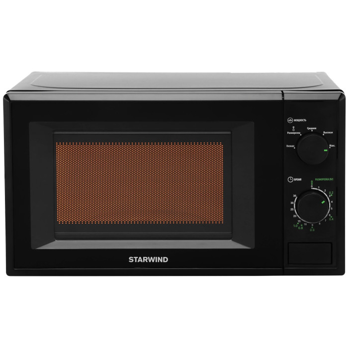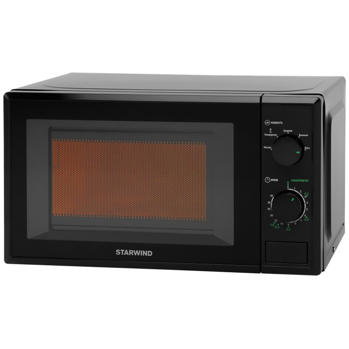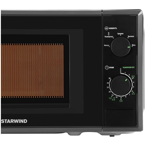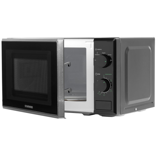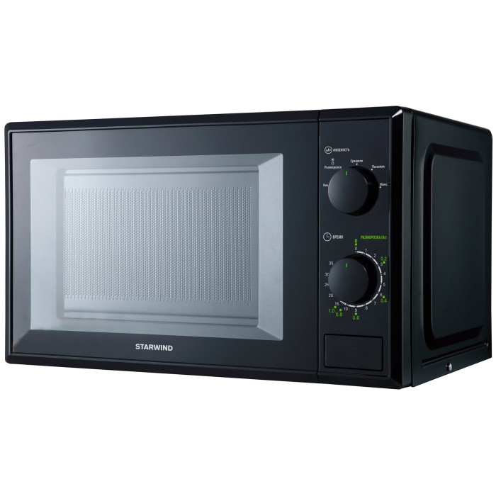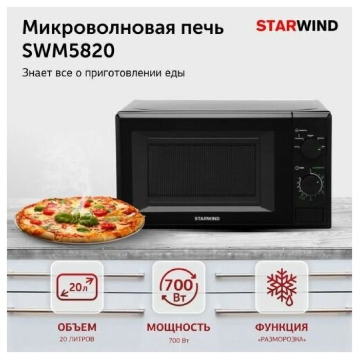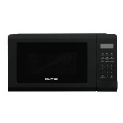 Микроволновая печь Starwind SWM5820 привлекает к себе внимание современным дизайном, корпус черного цвета подойдет для любого стиля интерьера. Оборудование имеет довольно простую конструкцию и компактные размеры. Использовать его можно как дома, так и в офисе. Бытовая техника поможет во время обеденного перерыва быстро подогреть еду. В домашних условиях микроволновую печь удобно использовать для размораживания продуктов, полноценного приготовления различных блюд. Мощность устройства составляет 700 Ватт. Внутренняя часть имеет объем в 20 литров, покрытие у нее из эмали, которая легко и быстро чистится. Управлять бытовым прибором необходимо с помощью поворотных рукояток, позволяющих установить нужно время нагрева и температуру.