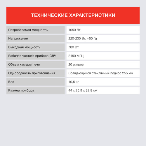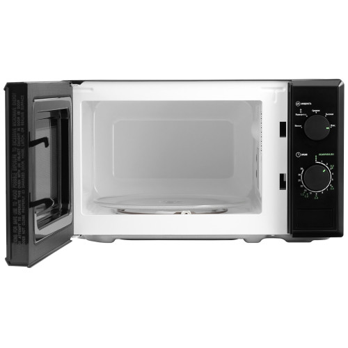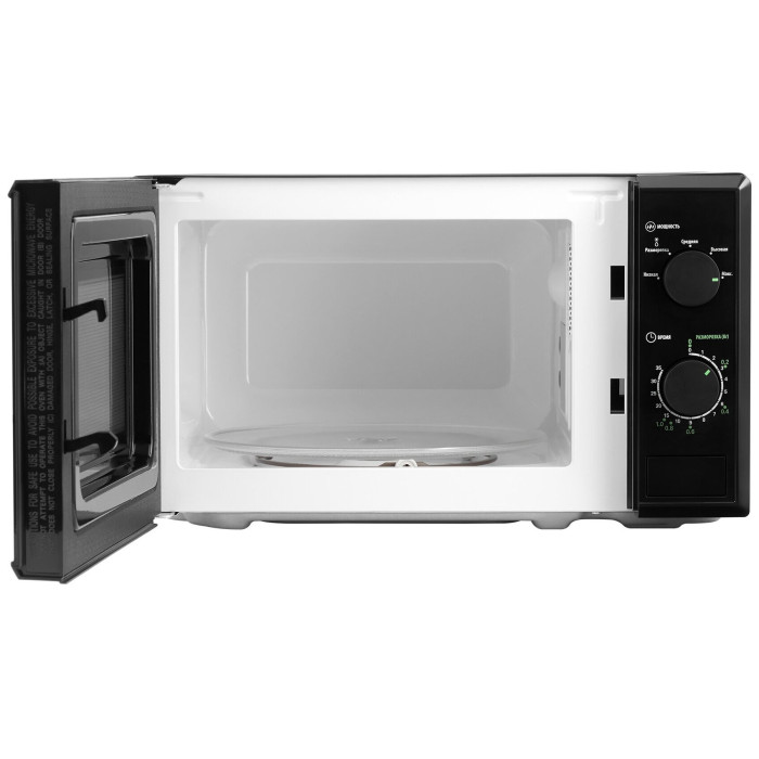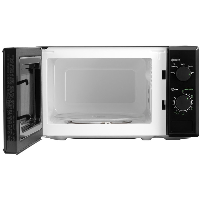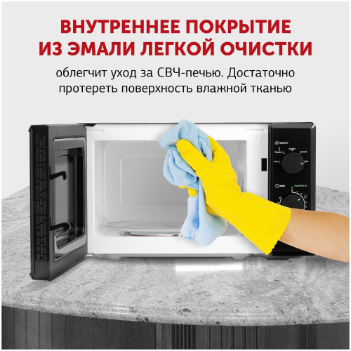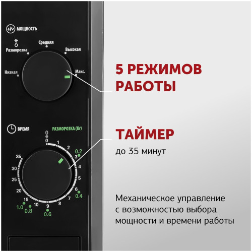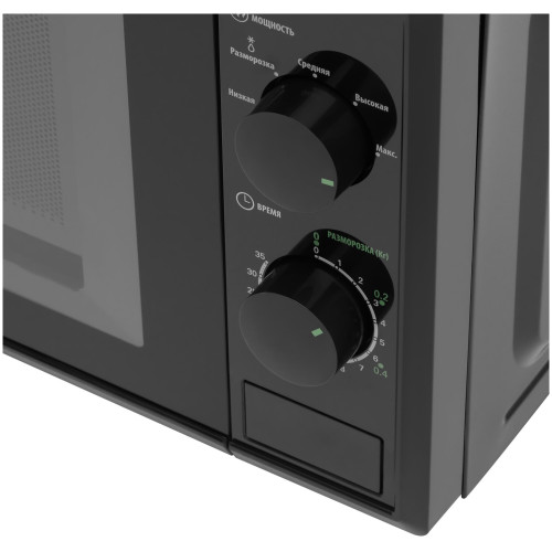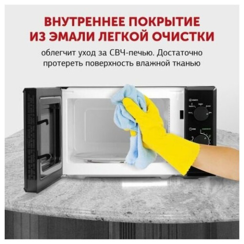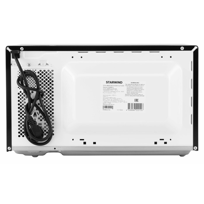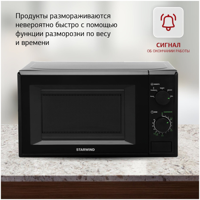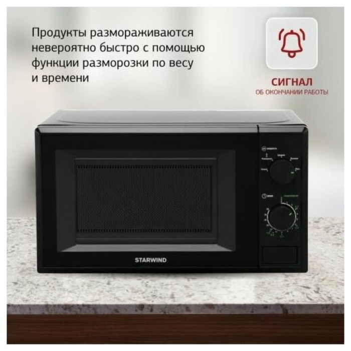 Микроволновая печь Starwind SWM5820 привлекает к себе внимание современным дизайном, корпус черного цвета подойдет для любого стиля интерьера. Оборудование имеет довольно простую конструкцию и компактные размеры. Использовать его можно как дома, так и в офисе. Бытовая техника поможет во время обеденного перерыва быстро подогреть еду. В домашних условиях микроволновую печь удобно использовать для размораживания продуктов, полноценного приготовления различных блюд. Мощность устройства составляет 700 Ватт. Внутренняя часть имеет объем в 20 литров, покрытие у нее из эмали, которая легко и быстро чистится. Управлять бытовым прибором необходимо с помощью поворотных рукояток, позволяющих установить нужно время нагрева и температуру.