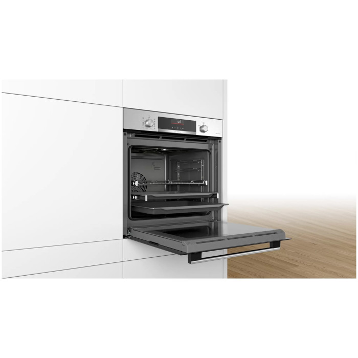 Bosch Serie | 6 HBG536YS0R – электрический духовой шкаф встраиваемого типа. Это вместительная модель, дополненная грилем, позволяющим жарить мясо и рыбу до образования румяной корочки. Функция Autopilot предназначена для тех, кто не доверяет своим кулинарным талантам либо хочет сэкономить время. Нужно лишь поставить блюдо в духовку, выбрать одну из десяти программ, указать вес продуктов и нажать кнопку «Старт». Вкусная еда будет готова без вашего участия. безупречное пропекание В 3D-режиме горячий воздух равномерно распределяется по камере, что позволяет добиться превосходного результата на всех трёх уровнях, вместе или по отдельности. Простой уход: на внутренние стенки нанесено покрытие из эмали, которое при нагревании расщепляет частицы жира. Благодаря этому они легко очищаются с помощью влажной тряпочки или салфетки.