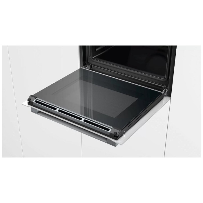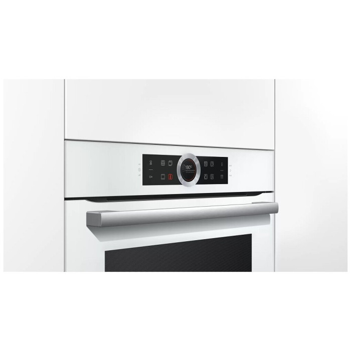 Белый духовой шкаф Bosch в строгом минималистичном исполнении. С такой техникой даже новичку под силу приготовить настоящий кулинарный шедевр.