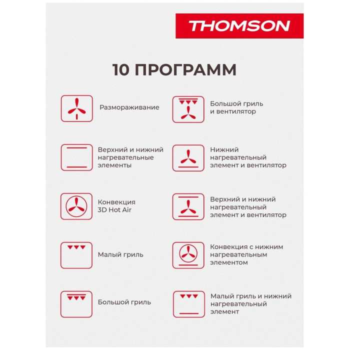большой гриль, конвекция, малый гриль, Большой гриль и вентилятор, Верхний и нижний нагревательные элементы, Верхний и нижний нагревательные элементы и вентилятор, Конвекция с нижним нагревательным элементов (пицца), Малый гриль и нижний нагревательный элемент, Нижний нагревательный элемент и вентилятор, Размораживание