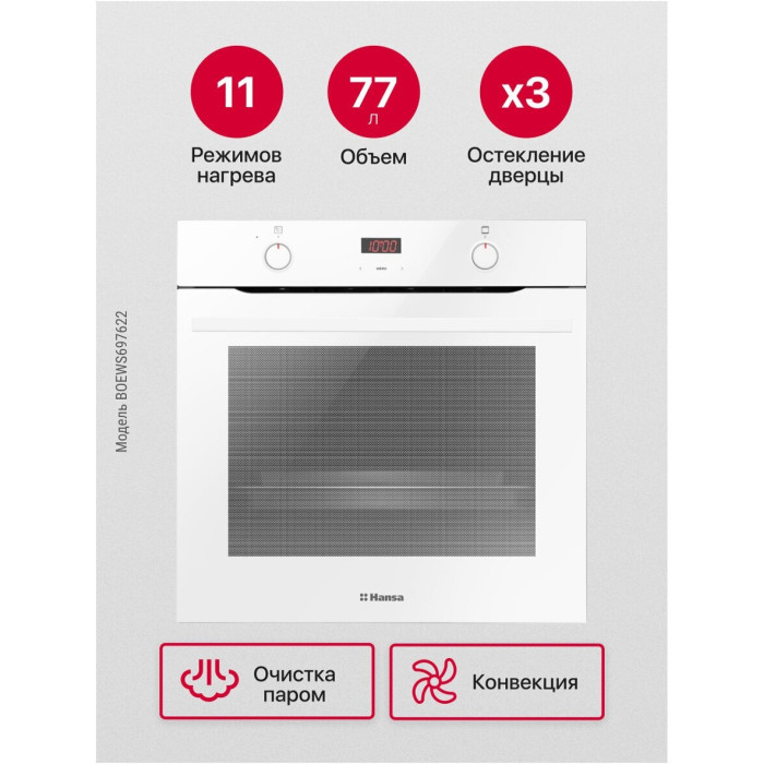 Hansa BOEWS697622 – электрический духовой шкаф с камерой объёмом 77 л, предназначенный для встраивания в подходящую по размеру нишу кухонного гарнитура. Модель не займёт много места, но при этом позволит готовить крупные порции для угощения всей семьи.