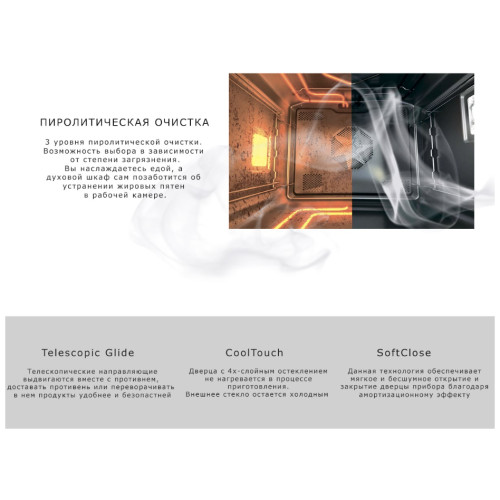 тип духовки: электрическая, установка: независимая, ширина: 59.40 см, конвекция, гриль, тип гриля: электрический, очистка духовки: пиролитическая, объем духовки: 73 л, количество стекол дверцы духовки: четыре, переключатели: сенсорные, класс энергопотребления: A+, особенности конструкции: дисплей, подсветка камеры, телескопические направляющие, часы, дополнительные функции: подогрев посуды, таймер, высота: 45.40 см, максимальная температура: 260 °C, безопасность: система защиты от детей