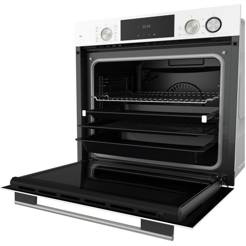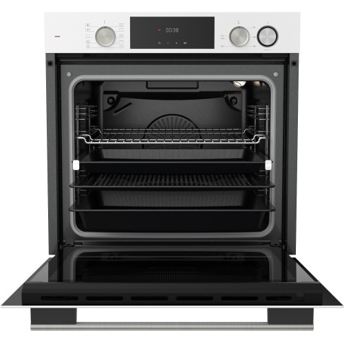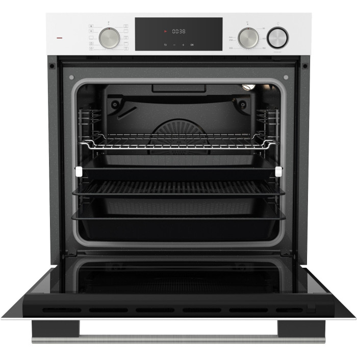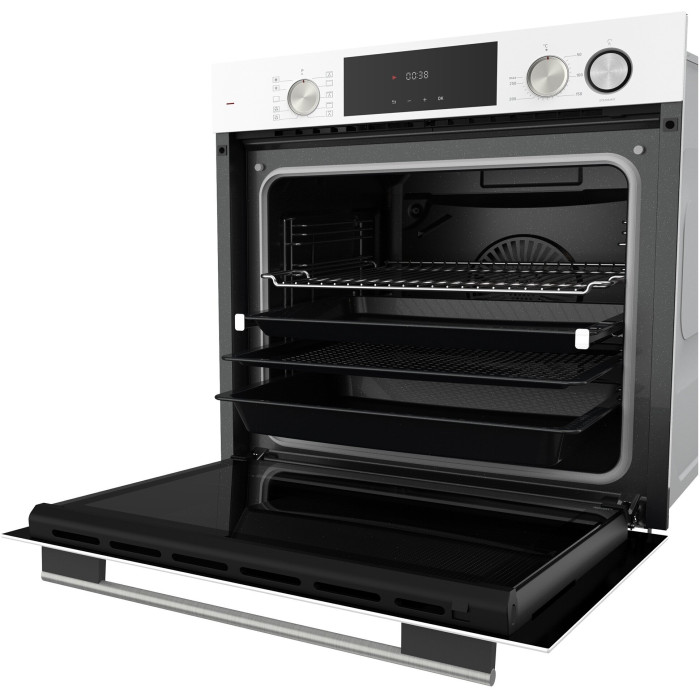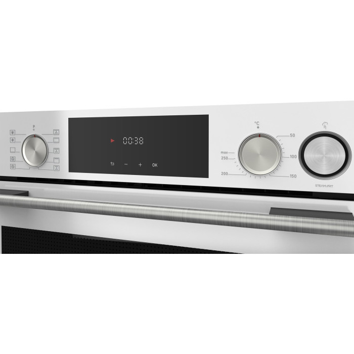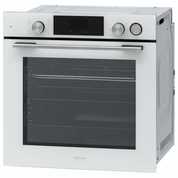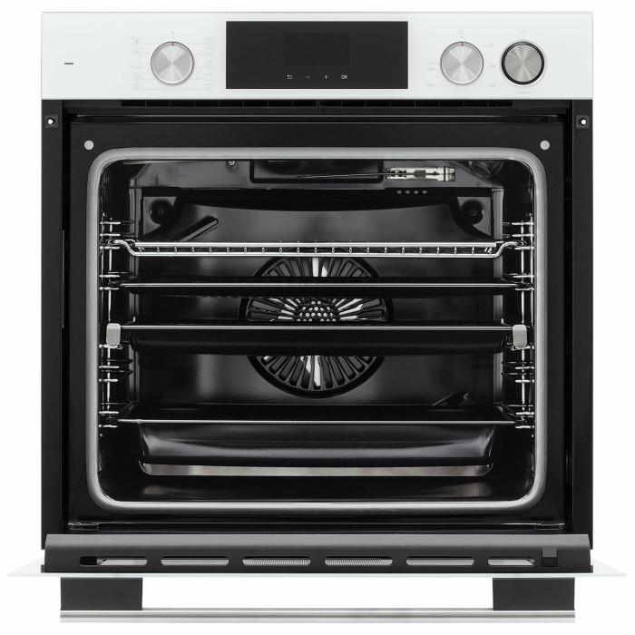 Электрический духовой шкаф с функцией пароварки NEBULA steam шириной встраивания 60 см выполнен в современном стиле из белого закаленного стекла. Модель имеет увеличенный объем Extra Large - 87,7 литров, благодаря которому вы без проблем сможете готовить большое количество порций на нескольких уровнях. Дверца духового шкафа выполнена из закаленного стекла Schott Ceran и имеет усиленную теплоизоляцию LOW-E. NEBULA steam оснащена 10 режимами работы, а также функцией пароварки с системой подачи пара Steam Assisted, которую можно всключить дополнительно к любому режиму приготовления. Расширенные возможности приготовления обеспечивают дополнительные функции духового шкафа - гриль, 3D-конвекция, режим интенсивного запекания Air Fry, функция разморозки, удобный электронный таймер с функциями напоминания/включения/отключения. Для вашего удобства в модели предусмотрены телескопические направляющие на одном уровне, которые обеспечат легкий доступ к блюду во время приготовления. Расширенная комплектация модели, в которую входят: стандартный противень, глубокий противень, стандартный перфорированный противень, решетка для гриля - станут безусловным преимуществом для пользователей.