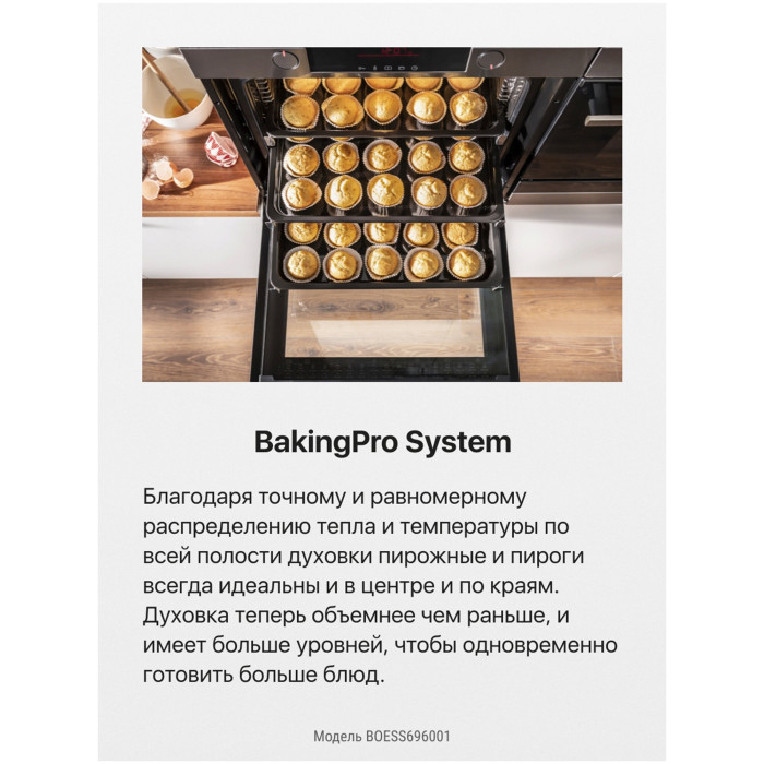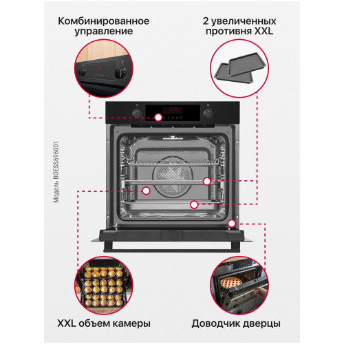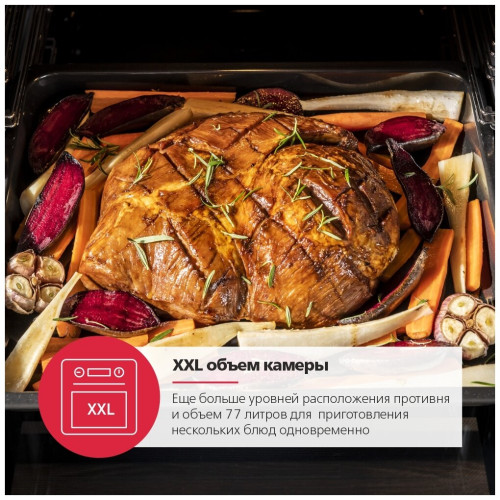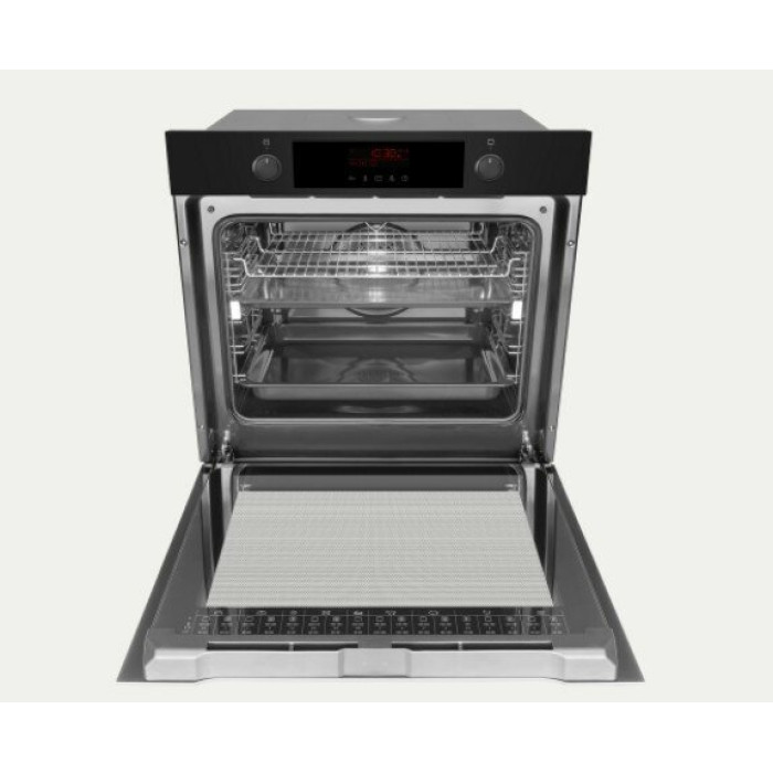 электронные часы, вентилятор охлаждения, звуковой таймер с отключением, тип программатора PRO Control Tn, быстрый предварительный нагрев 150° за 3 мин, cъемное стекло дверцы, рецепты на внутреннем стекле дверцы, хромированные направляющие для противней, мощность верхнего нагревателя 900 Вт, мощность нижнего нагревателя 700 Вт, мощность кольцевого нагревателя 2100 Вт, длина шнура 150 см, размеры ниши для встраивания (ВхШхГ) 595x560x560 мм, вес без упаковки 48.1 кг, количество уровней установки противня - 6, очистка паром Aqualytic, тип подключения однофазное 220В, энергопотребление 0.99 кВт/ч, BakingPro System, функция пара SoftSteam, 3D нагрев, доводчик дверцы SoftClose