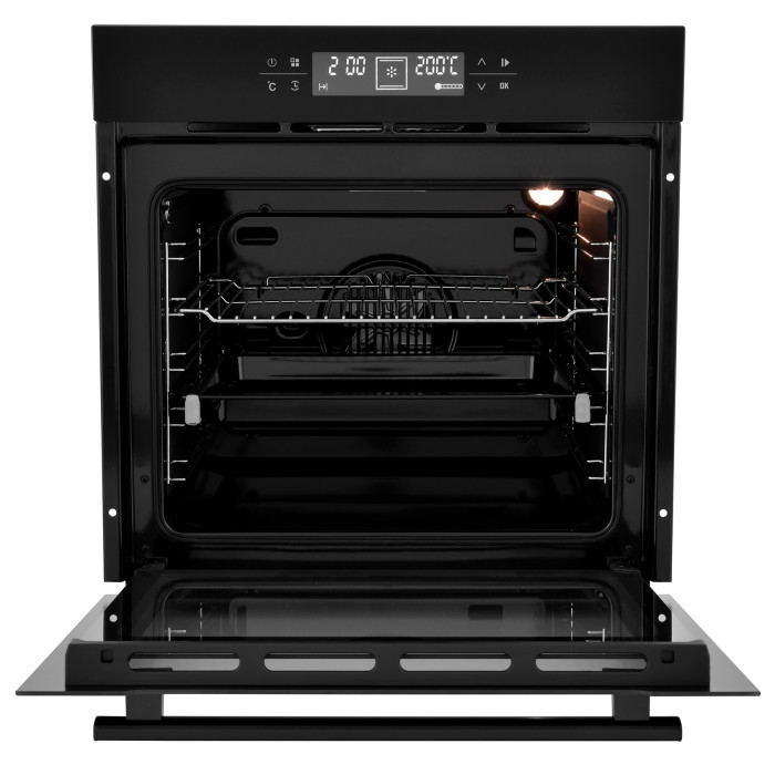 Вентилятор охлаждения, Встроенные часы, Доводчик дверцы духовки, Полностью стеклянная внутренняя дверца, Рецепты на двери, Термощуп, Хромированные направляющие