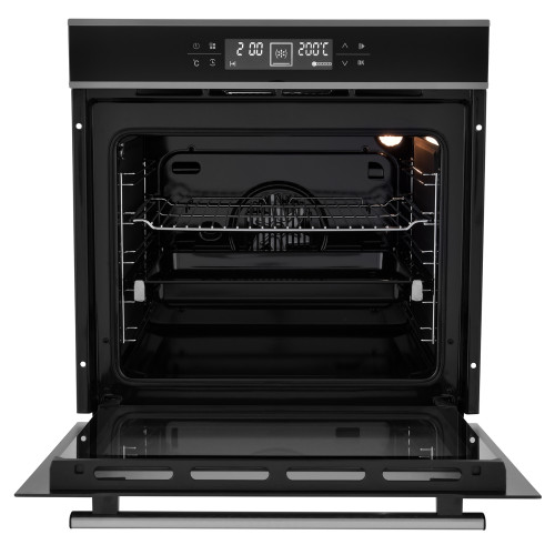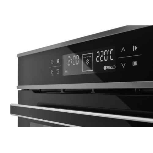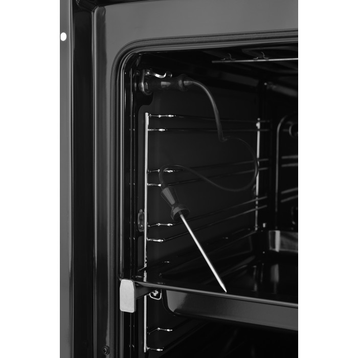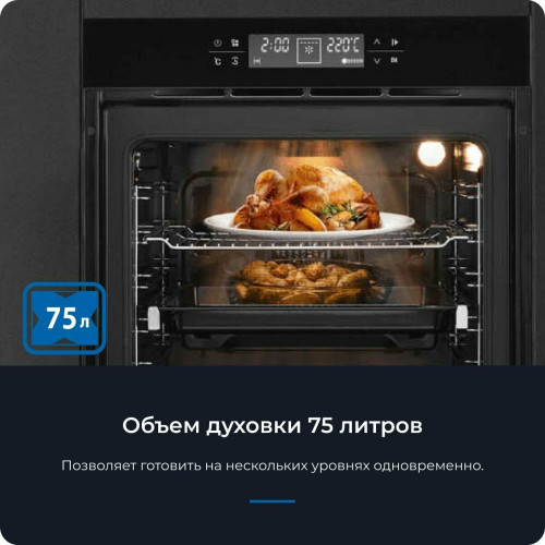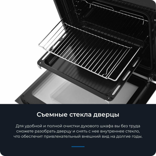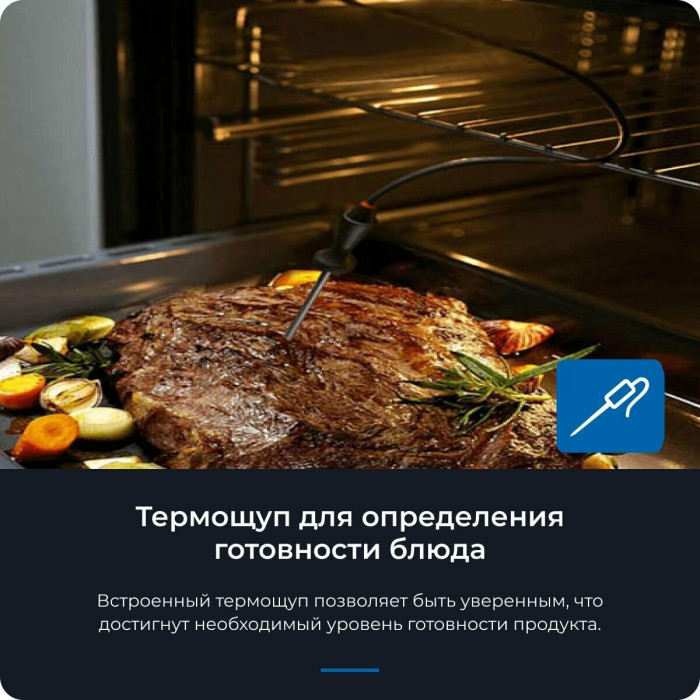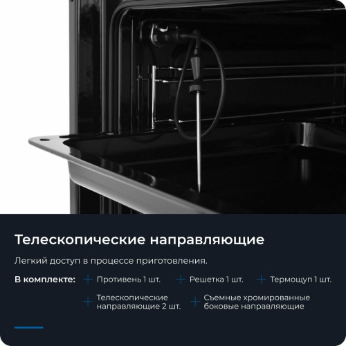 Вентилятор охлаждения, Встроенные часы, Доводчик дверцы духовки, Полностью стеклянная внутренняя дверца, Рецепты на двери, Термощуп, Хромированные направляющие