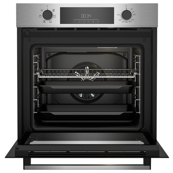 Встраиваемая духовка цвета нержавеющей стали имеет объем 72 л и удобное управление с поворотными переключателями, электронным таймером и блокировкой кнопок от случайного нажатия. Духовой шкаф предлагает 6 режимов работы, включая верхний и нижний нагрев, конвекцию и гриль, и функцию Booster, которая позволяет быстро разогреть духовку и сэкономить время приготовления блюда. Дверца духового шкафа и имеет 2 стекла и не нагревается с внешней стороны. В комплекте с духовкой идут стандартный, глубокий противень и решетка.